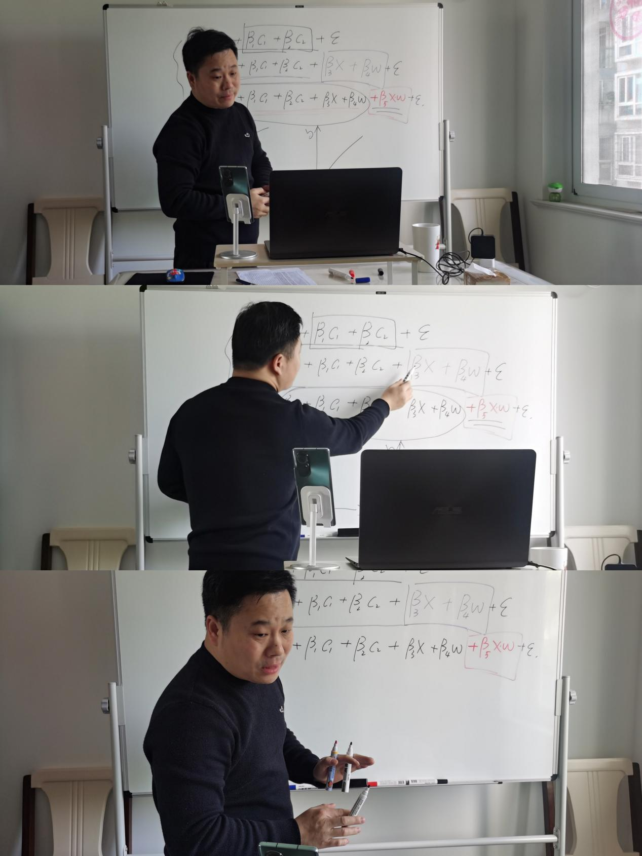 财务管理专业卢红旭老师给19级财务管理专业员工上《计量经济学》,需要复杂计算,光口头线上讲讲员工一下子还不能理解。因此他自己花钱买了白板,把餐桌当成讲台,把客厅当成课堂,支起来笔记本电脑和手机,电脑进行软件操作,黑板讲解原理过程,进行对照讲解,效果明显好转。员工们也在屏幕纷纷点赞“红旭哥”。