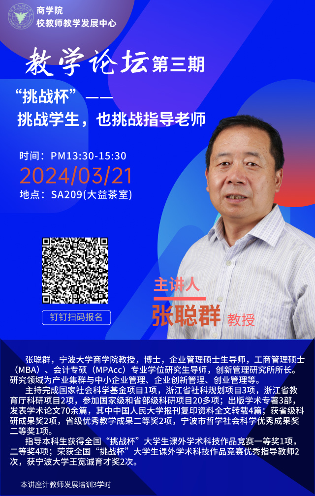 张聪群,宁波大学yl23411永利官网登录教授,博士,企业管理硕士生导师,工商管理硕士(MBA)、会计专硕(MPAcc)专业学位研究生导师,创新管理研究所所长。担任宁波市民营企业家协会专家组成员,宁波市小微企业创业创新导师团首批导师。