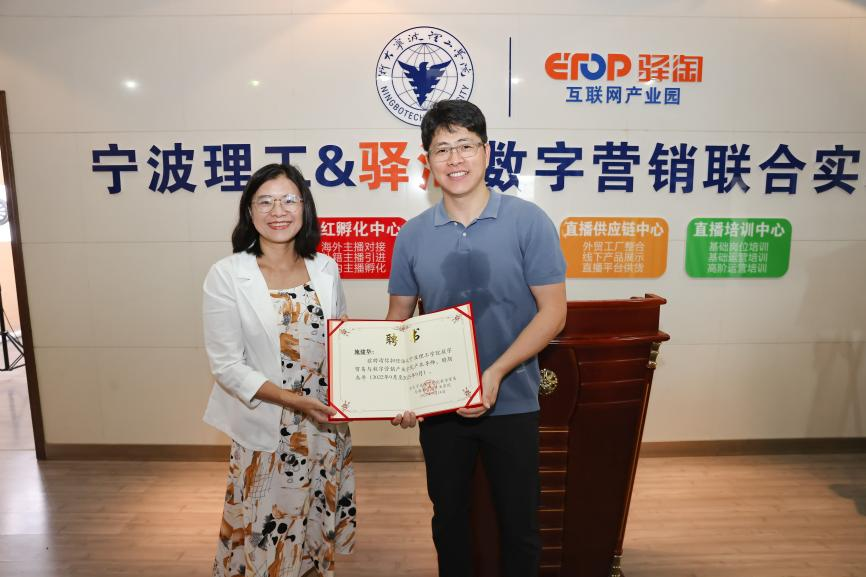 会上,鲁东明副董事长、施建华董事长共同为浙大宁理&驿淘数字营销联合实验室揭牌。教务处沈昊宇处长为施建华董事长颁发产业导师聘书。参会人员兴致勃勃地参观了Tiktok跨境营销直播间。