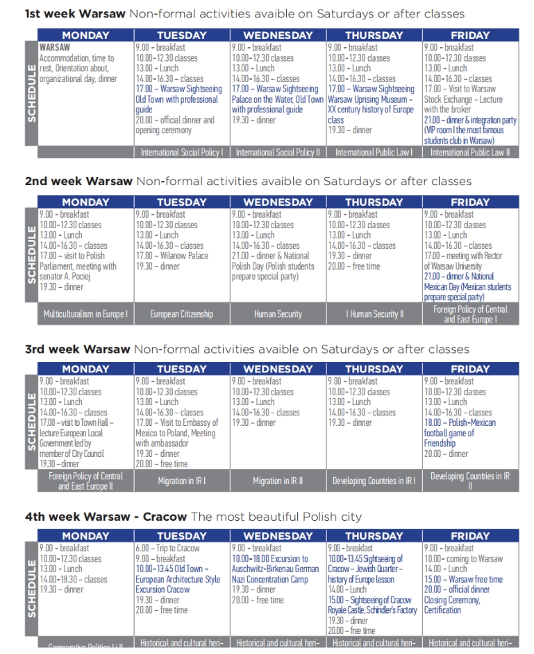 9:00 早餐10:00-12:30 上课13:00 中饭14:00-16:30 上课17.00–访问墨西哥驻波兰大使馆,会见大使19.30–晚餐20.00–空闲时间 |