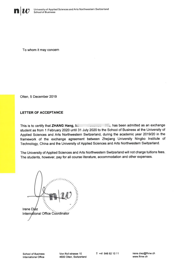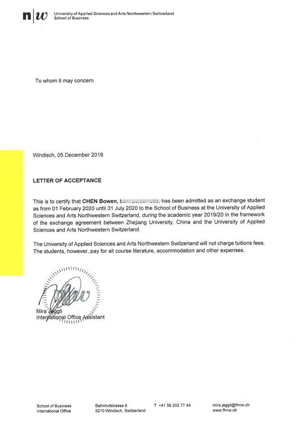 日前,yl23411永利官网登录学子陈柏闻(金融17级)和张航(国商18级)收到瑞士西北应用科学与艺术大学(FHNW)2020年春季学期交流生录取通知书,计划于2020年2月前往瑞士进行为期一学期的公费学习。届时,他们将和来自世界各地的同学一起在FNNW学习商科相关的全英文课程。这标志着yl23411永利官网登录与瑞士西北应用科学与艺术大学yl23411永利官网登录的员工互访项目进入实质性合作阶段。
