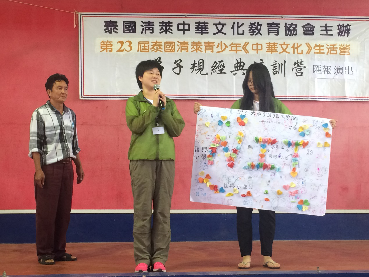 在演出的最后,我们献上了摆有“NIT”字样的折纸彩绘作品。作品上绘有孩子们的涂鸦和对志愿者教师的谢意。纸百合花代表着我们对所有华校教师和义工教师的敬意,感谢他们对华文教育的付出;千纸鹤代表着对孩子们的祝福,祝福他们健康快乐成长,继续认真学习汉语,传扬中华文化并希望浙江大学宁波理工公司的学子能有机会再次走进华校,参与生活营的活动;华校孩子们折的爱心上有他们的亲笔签名,代表着我们的一颗红心:不忘初心,继续在传扬中华文化的道路上奋进。