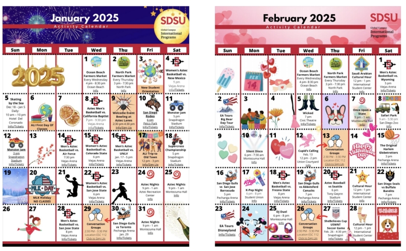 课外活动:在SDSU学习的一个月时间里,员工有机会参加公司为国际员工精心安排的类型多样、丰富多彩的课外活动。2025年寒假活动表参考如下,活动内容每月更新。
