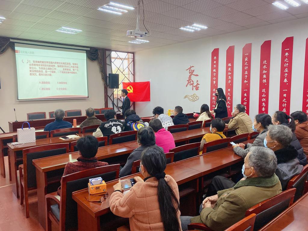 隐学社区(大公居委会)党支部书记谢村燕首先对宣讲团成员的到来表示感谢,并简要介绍了本次宣讲会的流程。金融学202班团支部团员何鲁彬同学围绕党的十九届六中全会精神学习向在座老党员、团员代表进行了宣讲。他围绕全会召开的时代背景,历史意义进行了介绍,并就党领导人民取得的历史性成就和党在治国理政方面获得的经验和方法做了互动式交流宣讲。宣讲结束后,现场开展了党的十九届六中全会知识竞猜活动,社区老党员们纷纷参与知识竞答,现场答题气氛热烈。