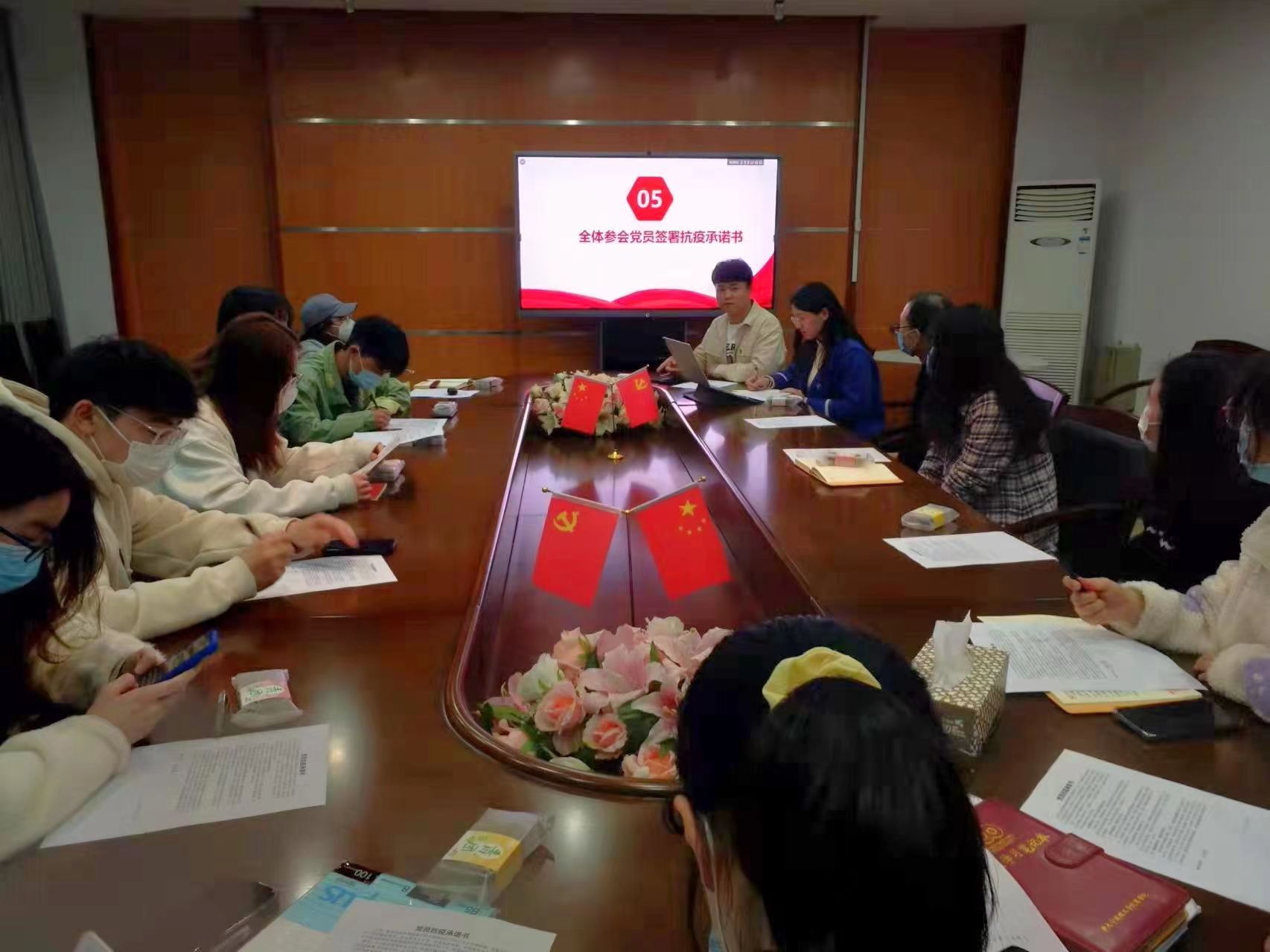 大会首先由赵昌志支部书记发言,概括了两会的重要内容和精神,强调了时代大背景和制度优势对防疫的积极作用。随后,预备党员主动分享了两会的学习感悟,中国近年来取得的伟大成就更加坚定了我们跟党走的决心。接着,开展防疫知识竞答,内容涵盖防疫的基本知识、防护措施、个人自身防疫知识等多个方面,支部书记赵昌志带头回答问题,各党员员工积极抢答,答题的环节大大加深了大家对新冠病毒传播途径的认识,提高了大家的防护意识。然后,党员同志分享了疫情中的温情故事,疫情中的温暖引人共鸣,让我们明白奉献的意义。最后,全体参会党员签署抗疫承诺书,进一步树立防疫意识,共同携手,共克时艰,坚决打赢疫情防控阻击战。