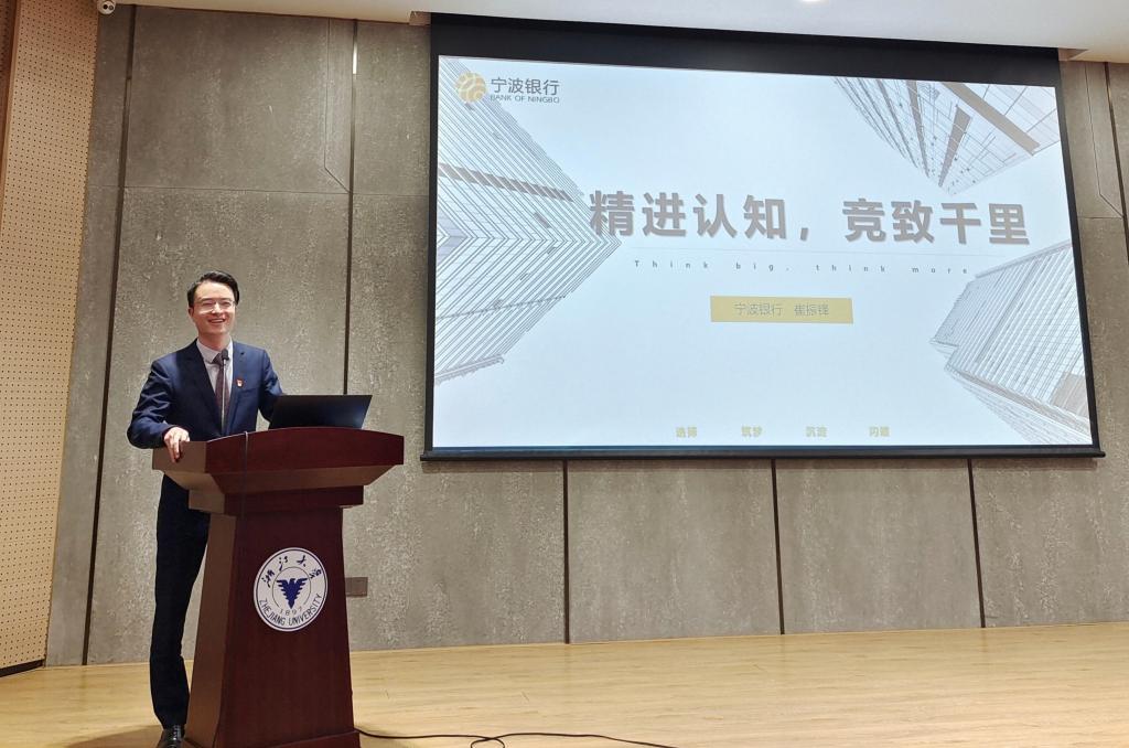 崔行长的《精进认知,竞致千里》为同学们讲述了金融行业的构成以及国内银行业发展,他用个人成长经历勉励同学们要打开思维边界,准确理解金融岗位,充分用好专业优势。最后他对宁波银行的发展历程进行了介绍。