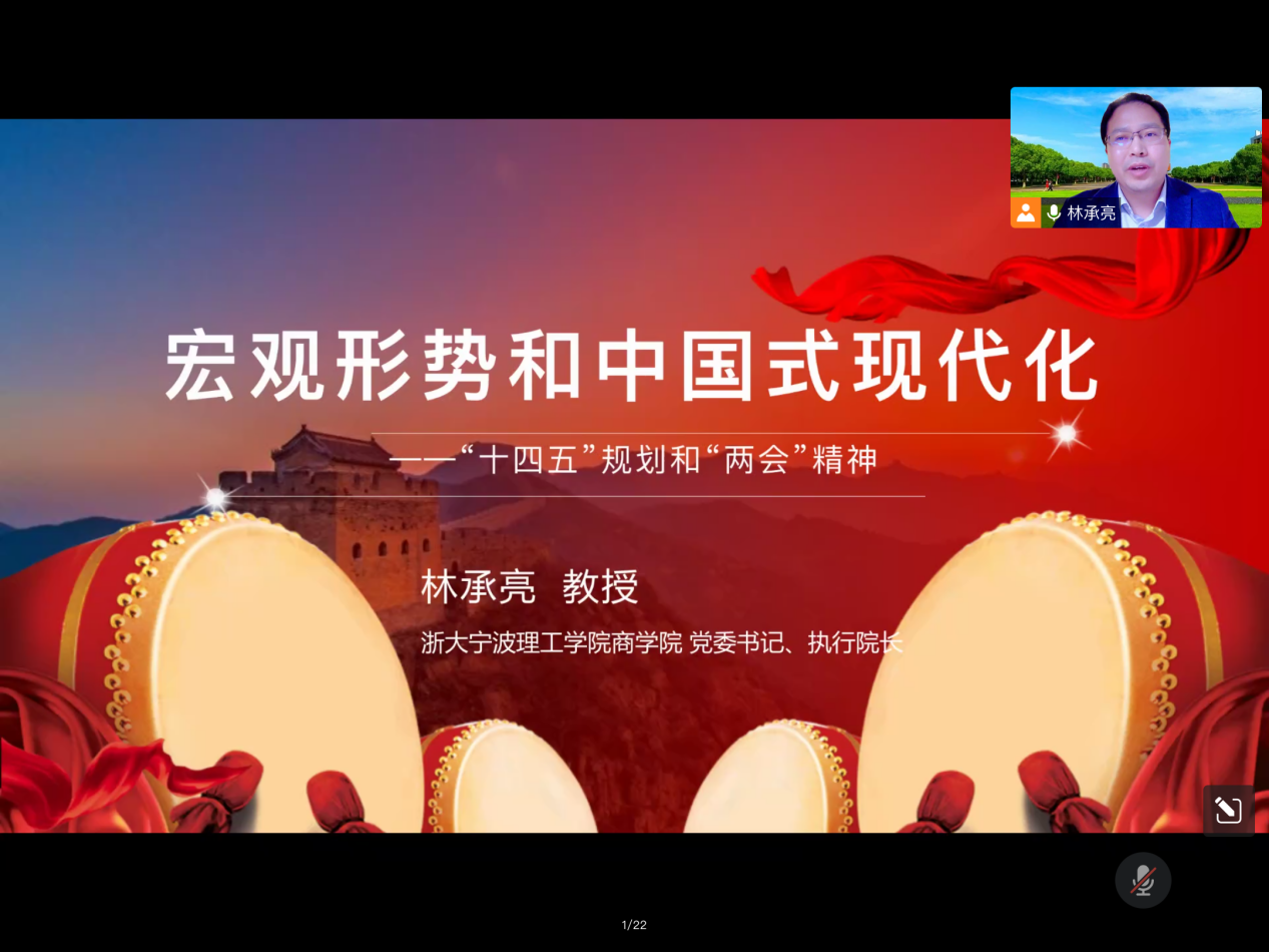 林承亮书记以“宏观形势和中国式现代化”为主题,聚焦“十四五”规划和两会精神,通过解读党的十九届五中全会公报和“十四五”规划纲要对国际国内形势进行总体判断;带领同学们深度学习了全国“两会”政府工作报告,分析形势趋紧的内外原因。通过学习,同学们充分认识到中国式现代化的五个特征,明白了实现中国式现代化的两大抓手是打造“双循环”新发展格局和科技自立自强。