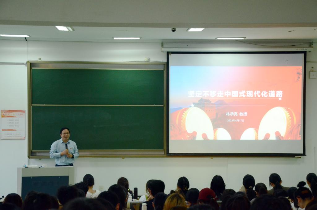 林承亮老师以《坚定不移走中国式现代化道路》为主题授课。他从“现代化和中国式现代化”、“为什么要选择中国式现代化道路”、“中国式现代化道路的两个关键”三个方面展开阐述,介绍了中国现代化的历史和现状,并深入分析了中国式现代化的特点和优势。他指出,中国式现代化的提出经历了不同的阶段,在二十大报告中的阐述为:“从现在起,中国共产党的中心任务就是团结带领全国各族人民全面建成社会主义现代化强国、实现第二个百年奋斗目标,以中国式现代化全面推进中华民族伟大复兴。”课上,林老师向学员们解释了有效市场与有为政府,强调了科技自立自强的重要性,提出了“解决科技自立自强瓶颈问题的关键不在于机制变革,而在于认知和观念的改变”。课堂中援引数例,进行了多维度的知识拓展。