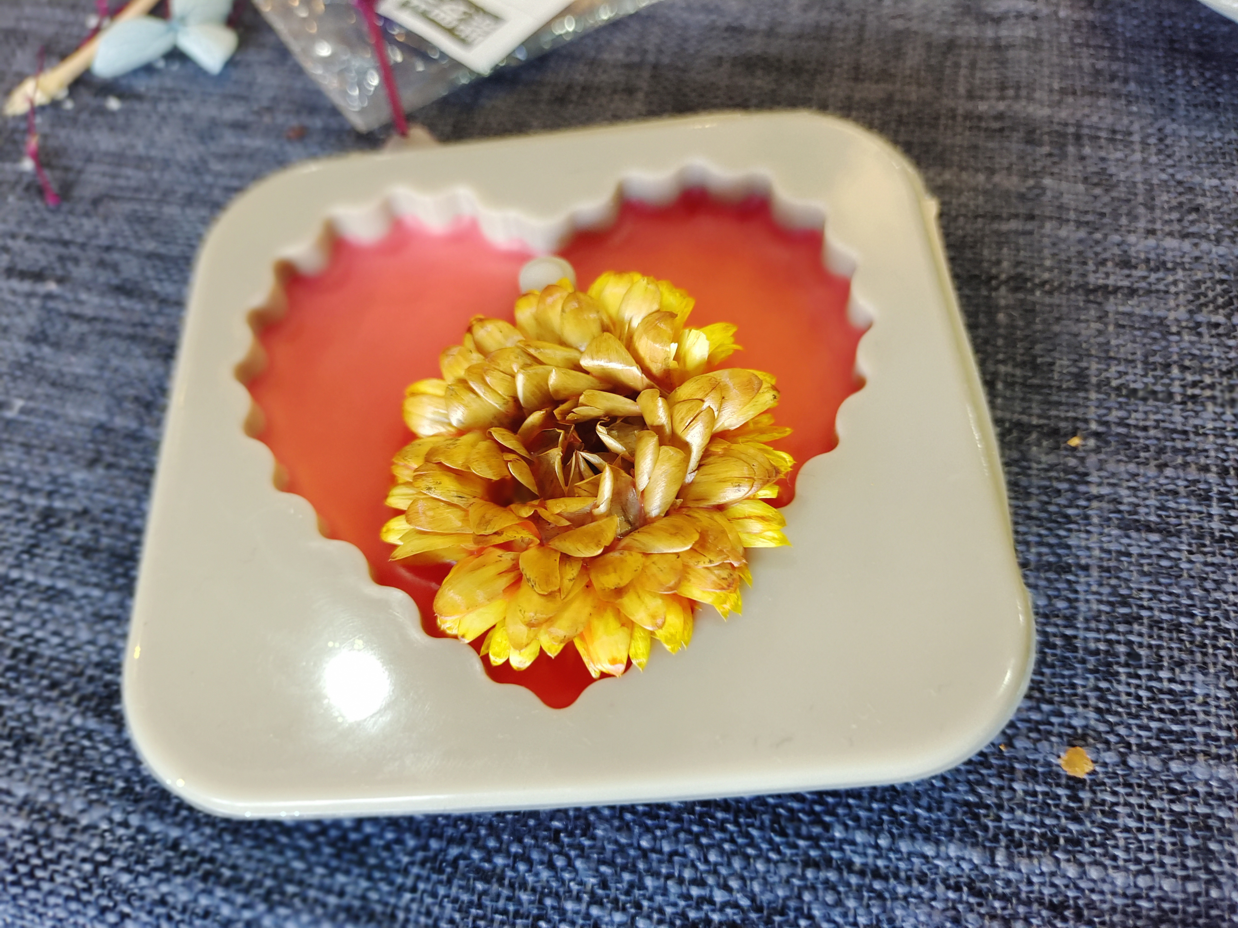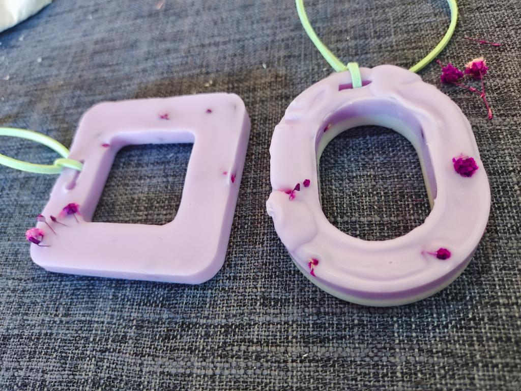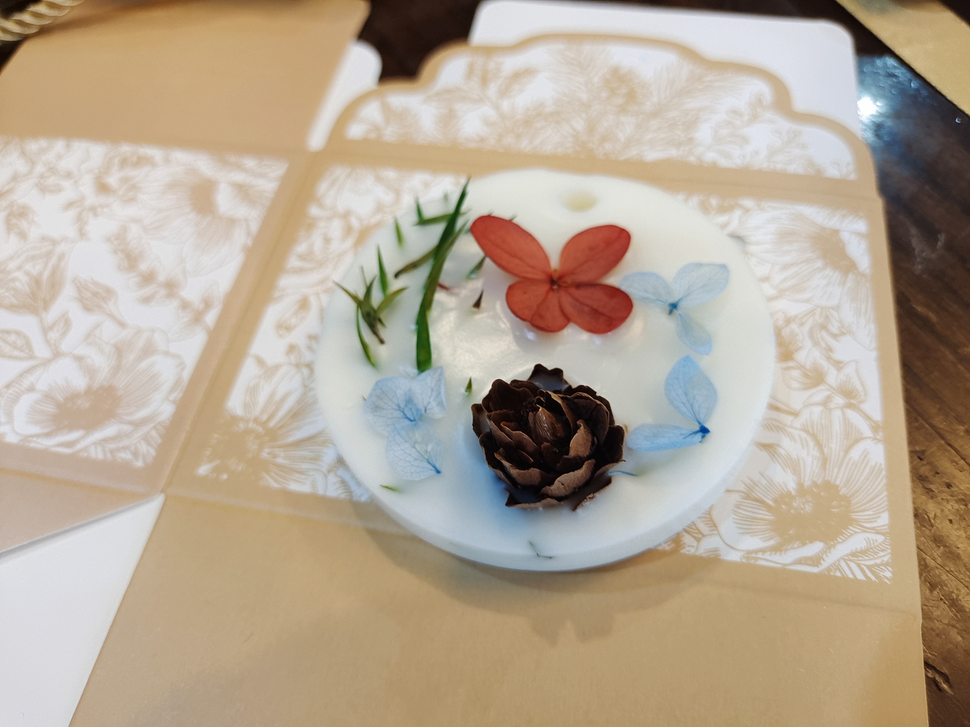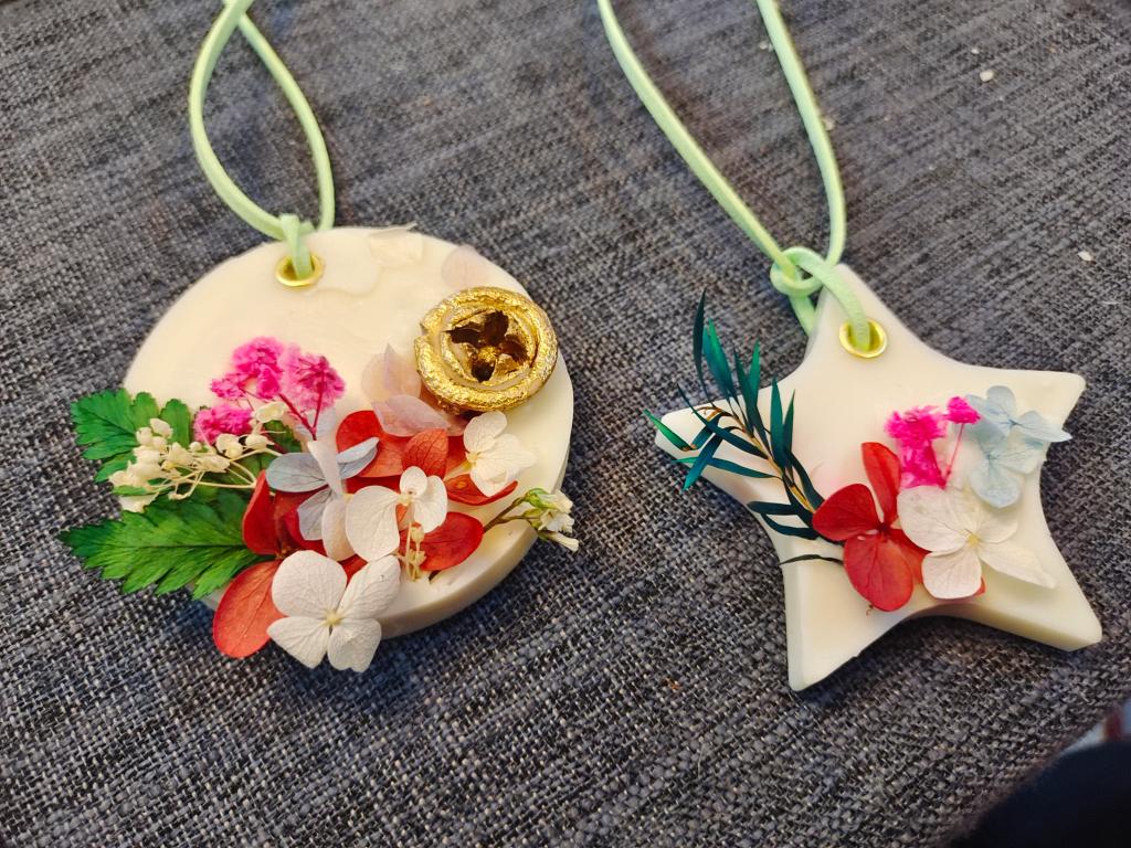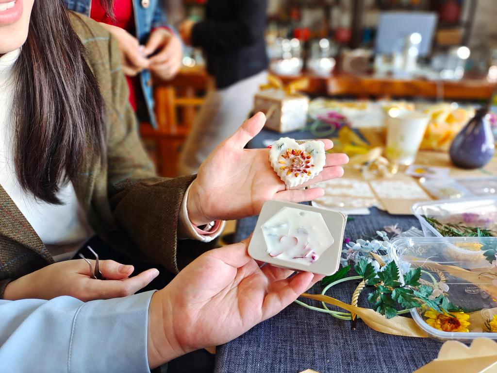 随后,根据制作流程,老师们拿起蜡片的材料,跟着讲解的步骤,一步一步慢慢尝试着进行制作。加热、充分地搅拌、滴入适量精油,蜡完全溶解后,倒入形状各异的模具中,在等待凝固的过程中,精心用干花装饰。不多久,一块块精致美观、散发幽香的蜡片在老师们的巧手下出现了!