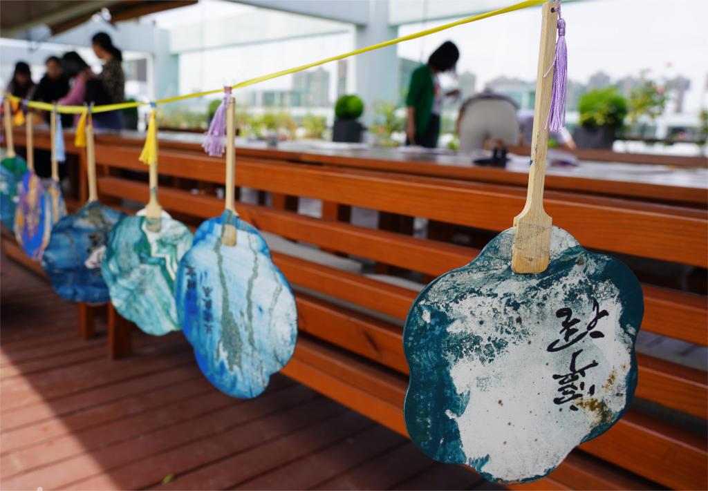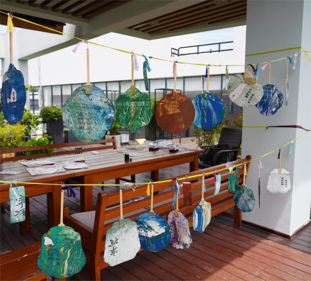 漆彩调色,纸扇承载,是一沉一提的水流艺术,展现了中国传统文化的瑰丽和精致。在这一晕一染间,老师们将宁理的春影刻印进了独属于自己的漆扇中。