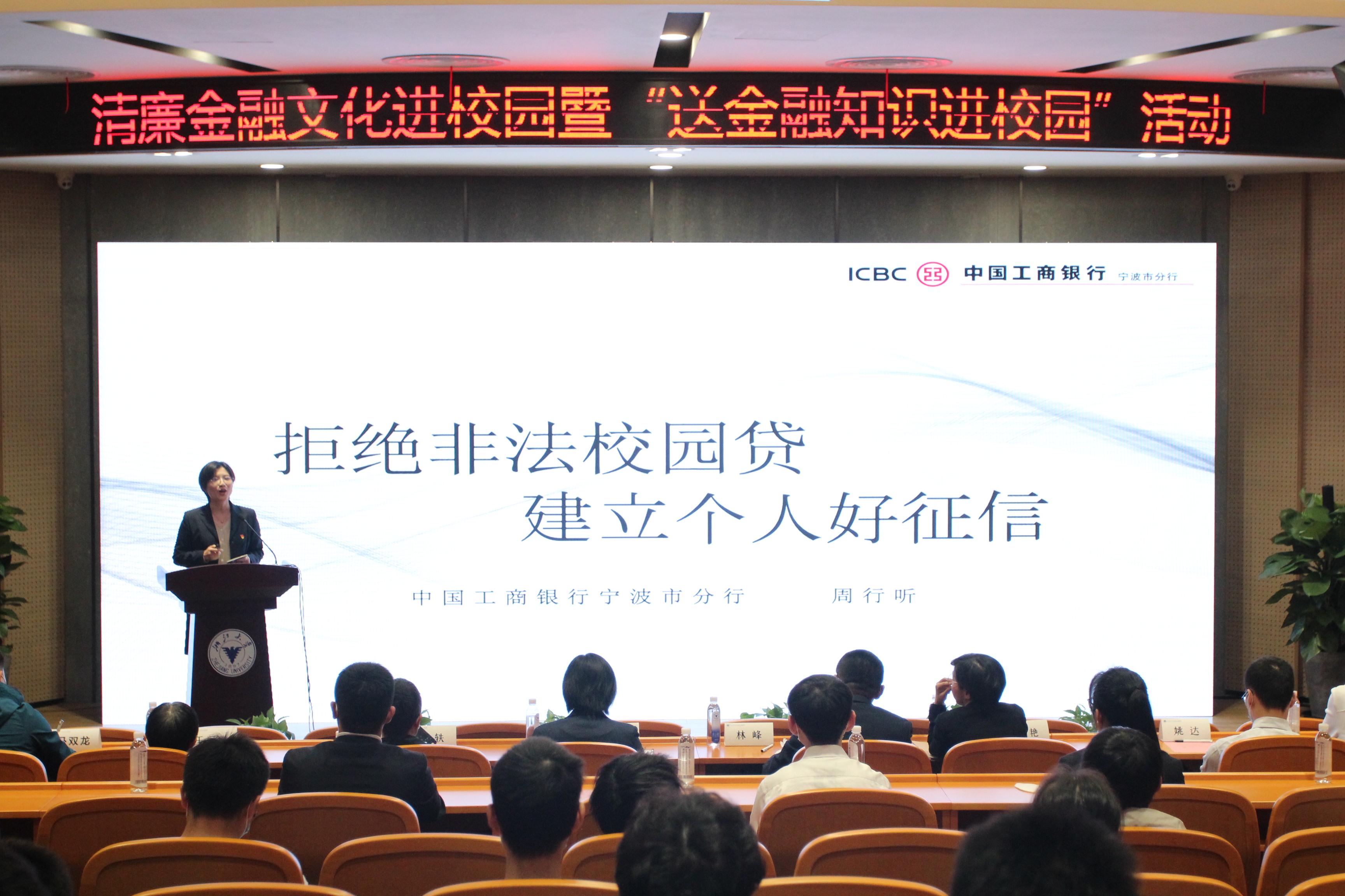 中国工商银行宁波市分行的青年讲师周行听带来的有关“如何拒绝非法校园贷,建立个人好征信”的金融知识分享。她向大家介绍正规借贷平台利率对比、还款方式、信用卡使用等的相关知识。