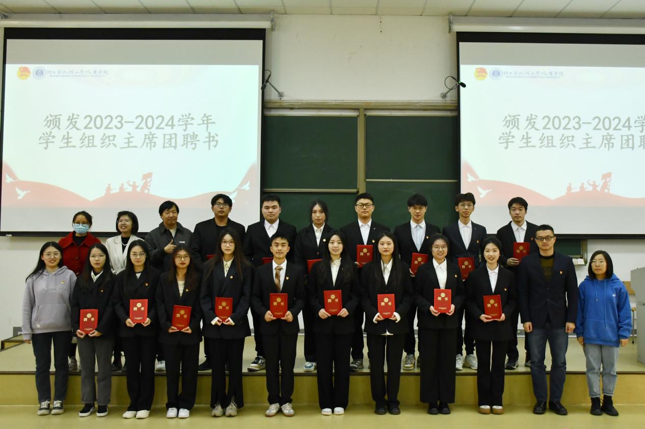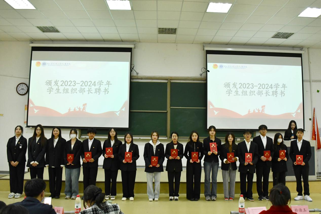 之后,吴琼老师为2023-2024学年团委书记、副书记颁发聘书,张楚铭老师为2022-2023学年主席团主席颁发考核证书。学工办老师们分别为新一届主席团主席以及各员工组织部长颁发聘书。