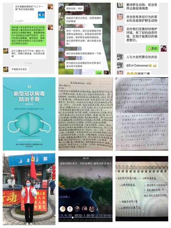 各员工党支部积极响应,策划了系列助力防疫的活动方案。如员工财务管理专业第一党支部、员工财务管理专业第二党支部、员工国贸专业党支部采取在微信微信平台、QQ群、视频电话、微博及新媒体平台上面向所在村镇或者居民进行宣讲。积极引导公众减少不必要的聚集性活动,动员社区居民打一场“人民战争”,使广大群众坚定“新型冠状病毒感染的肺炎”可防、可控、可治的信念,消除群众恐惧心理,切实稳定人心。