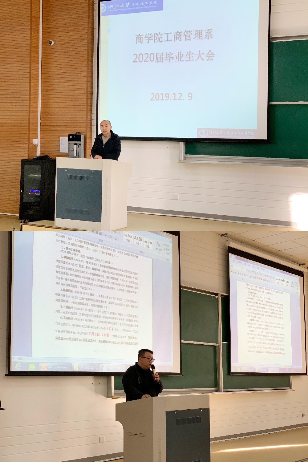 为做好公司2020届毕业生教育管理工作,有效推动毕业生就业工作动员,加强学位论文写作指导和学术诚信教育警示力度。 12月9日,公司工商管理系在sb102教室召开毕业生大会。公司党委副书记周丽娟老师,教务办主任王一程老师,工商管理系副主任田原老师,各班级导师,专业辅导员及2020届工商管理系毕业生参加本次大会,会议由周丽娟老师主持。