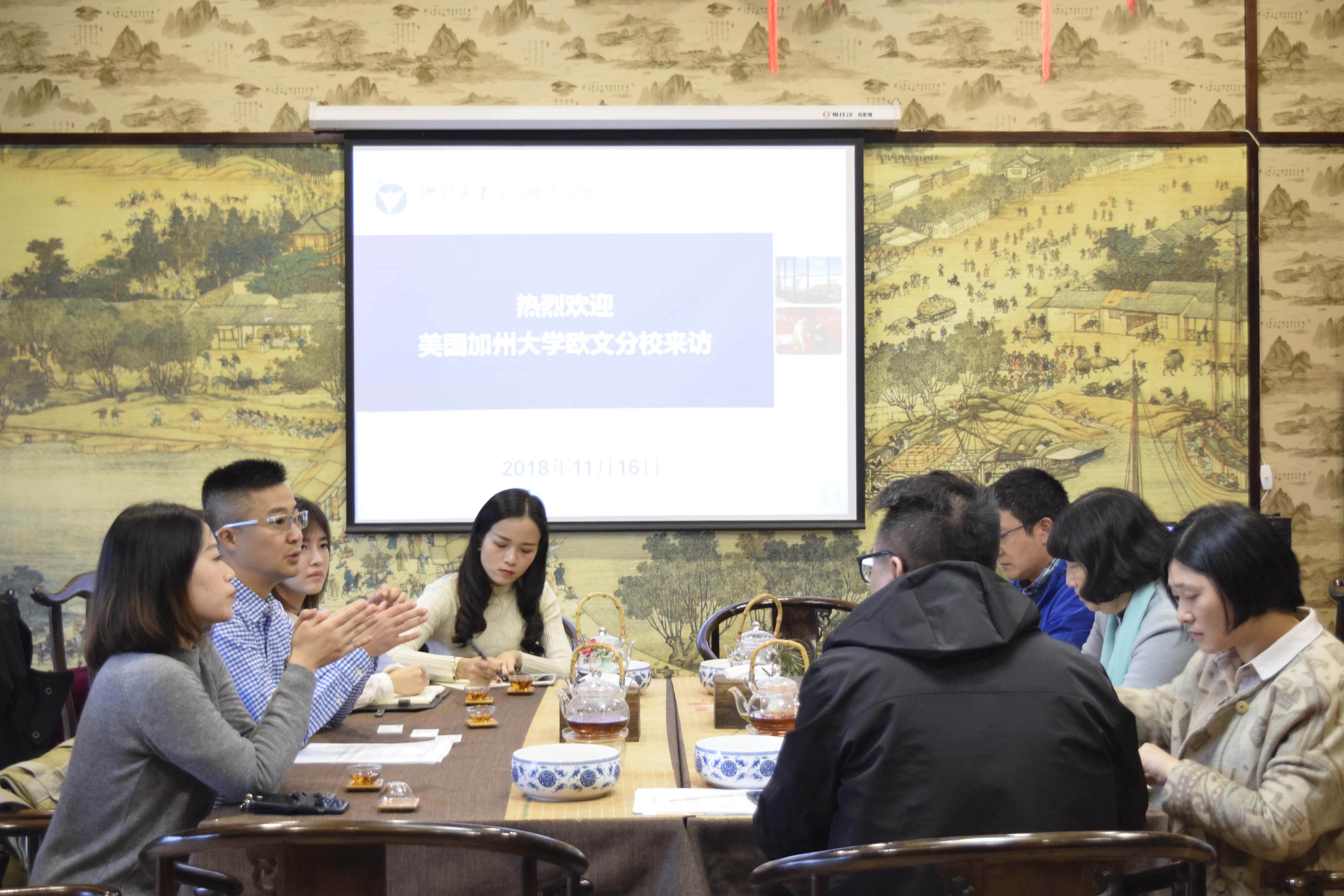 2018年11月16日下午,美国加州大学欧文分校中国市场负责人Ming Cai一行四人来公司就国际交换生项目进行交流。yl23411永利官网登录经理肖文、外事处副处长程萌、教学主管王一程及国际交流中心秘书叶婷婷出席交流会,双方就学期交流生的录取条件、课程选择、学分认定等问题展开讨论并达成共识。