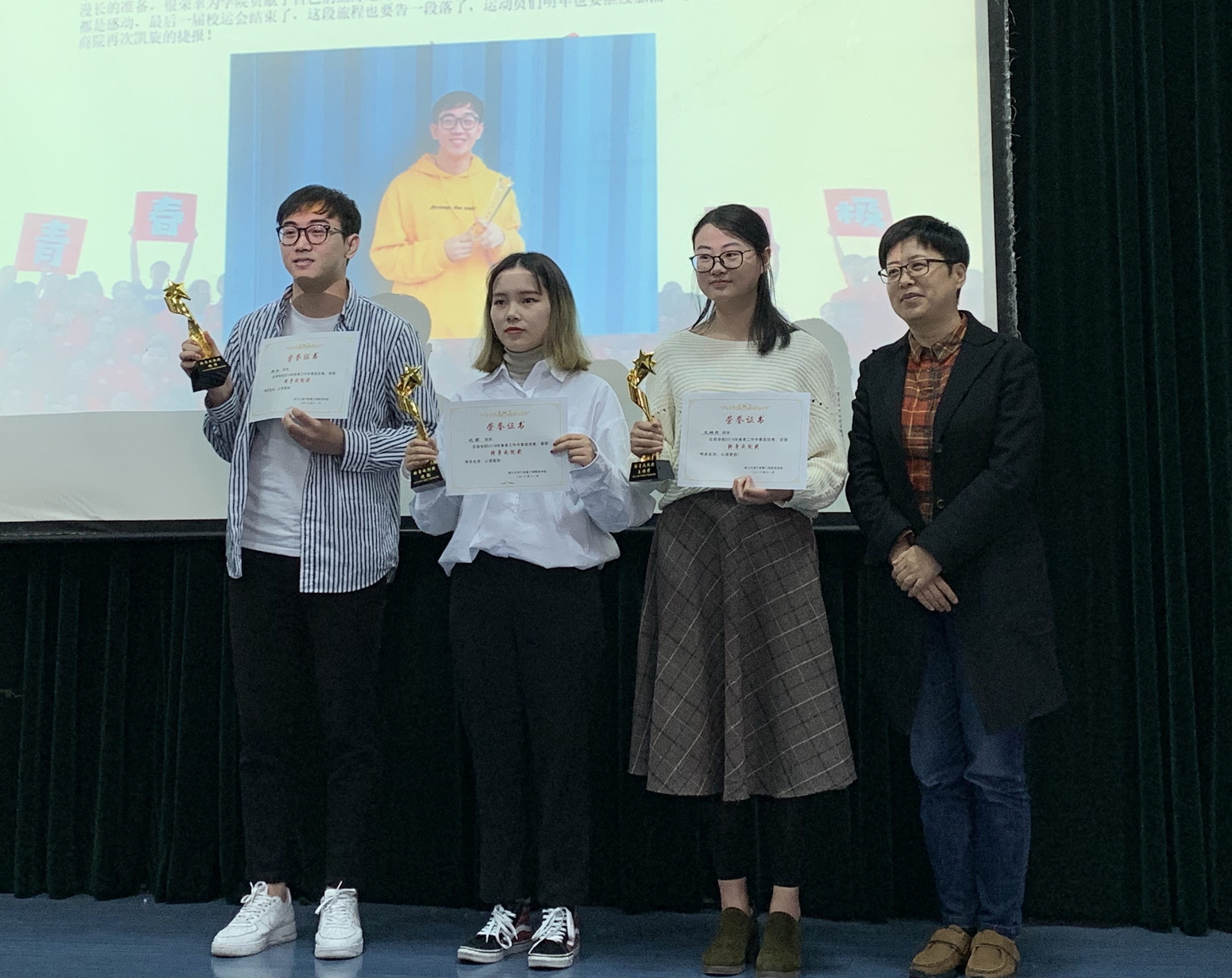大会开始,一段关于校运动会的视频拉开了此次大会的帷幕。首先,运动员代表上场发言并讲述自己的感悟。紧接着,便是颁布各类奖项。马双龙老师宣读并颁布了先进个人奖,柯乐乐老师颁布了优秀志愿者、通讯兵和先进班的奖项,赵涵老师颁布了突出贡献团体和个人奖,李萍萍老师则颁布了终身成就奖。