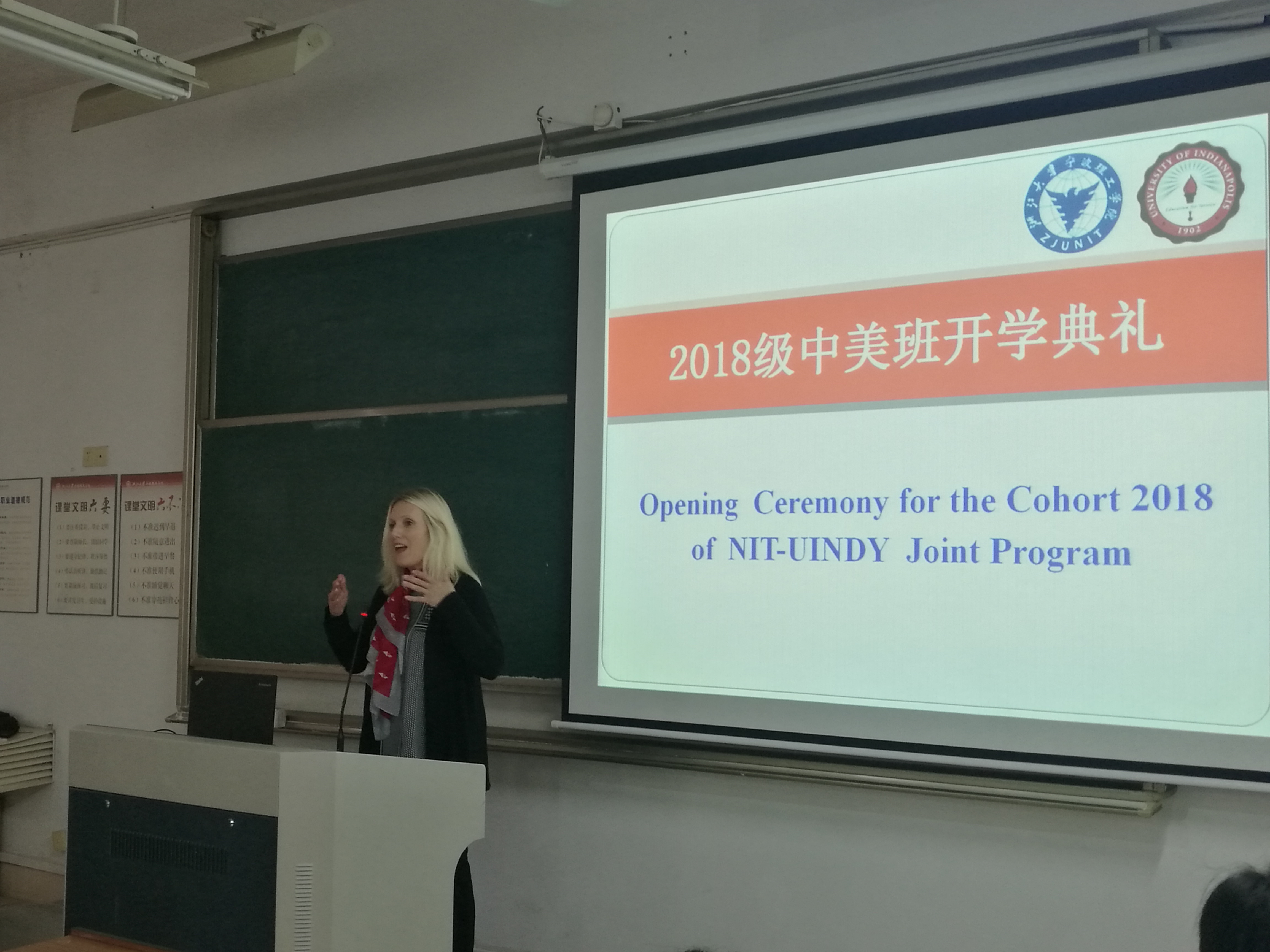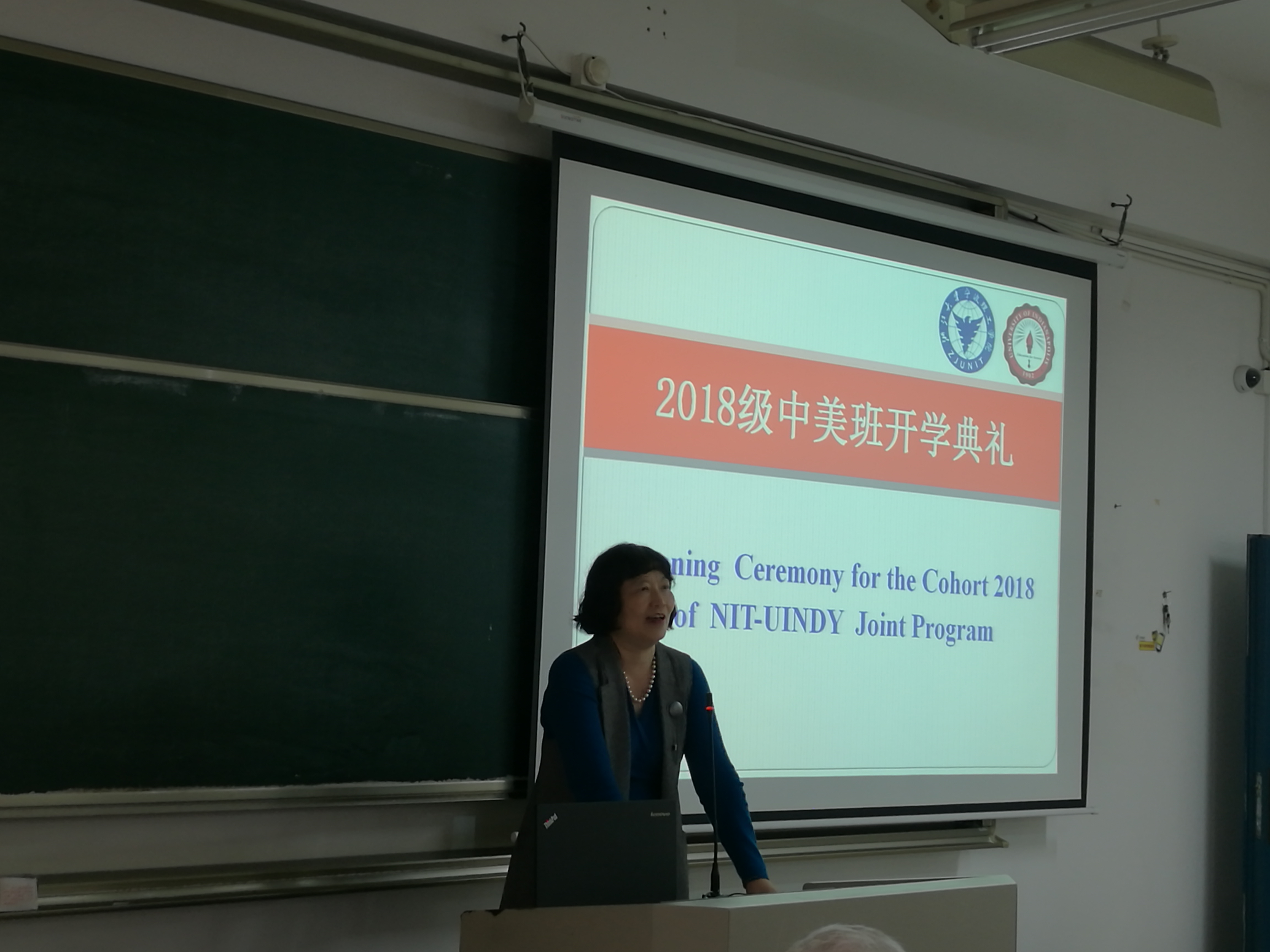 2018年10月22日下午,中美班2018级新生美方开学典礼在SB209举行。美国印第安纳波利斯大学(UIndy)副教务长Jodie Ferise、招生入学办公室项目联络人Ghina George-Sadek和文理公司国际项目主任Michael Milam,yl23411永利官网登录经理肖文,党委书记李萍萍、副经理鞠芳辉,国际交流中心秘书叶婷婷,外事处副处长程萌和章瑶出席了开学典礼,财务管理与金融研究所副所长丁宁主持开学典礼。肖文经理介绍了中美合作办学项目的发展历史,中美班团队队伍构成,中美2018届毕业生升学就业等情况,总结了中美班办学14年来取得的成果,鼓励2018级员工努力学习,刻苦钻研,争取人人顺利赴美完成学业。美方副教务长Jodie博士以自身的成长经历激励中美班新生勇于挑战自我,排除一切出境学习障碍,好好学习英语,开拓眼界,培养国际视角。Ghina介绍了UIndy概况,就新生关心的公司排名、专业设置、住宿条件、赴美申请流程、硕士生申请条件等问题进行一一解答。中美金融182班袁依婷作为新生代表发言。最后,美方代表向中美班18级新生赠送极具UIndy特色的纪念品。此次开学典礼进一步加深了中美18级新生对于中美合作办学项目的认识,为今后的学习生活指明了努力的方向。