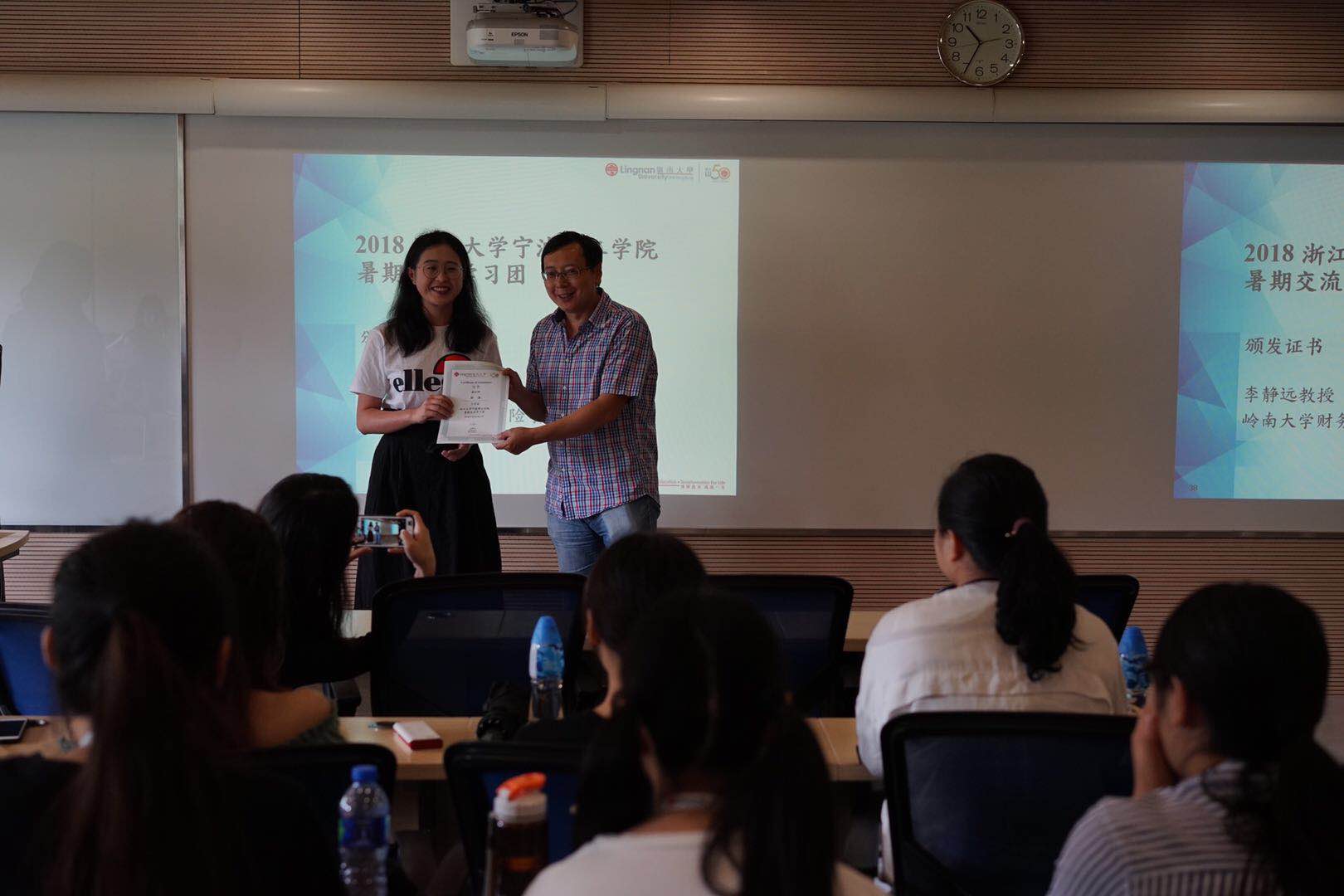 7月14日,yl23411永利官网登录师生完成了本次在香港学习交流的所有课程和实地调研,上午10点在岭南大学欧阳海演讲室举行了本次学习交流活动的结业礼。结业礼上,岭南大学yl23411永利官网登录保险与会计系主任李静远教授对本次学习交流活动进行了总结,对同学们的学习热情和态度给予了充分肯定,并为参加本次研习活动的师生颁发了结业证书。