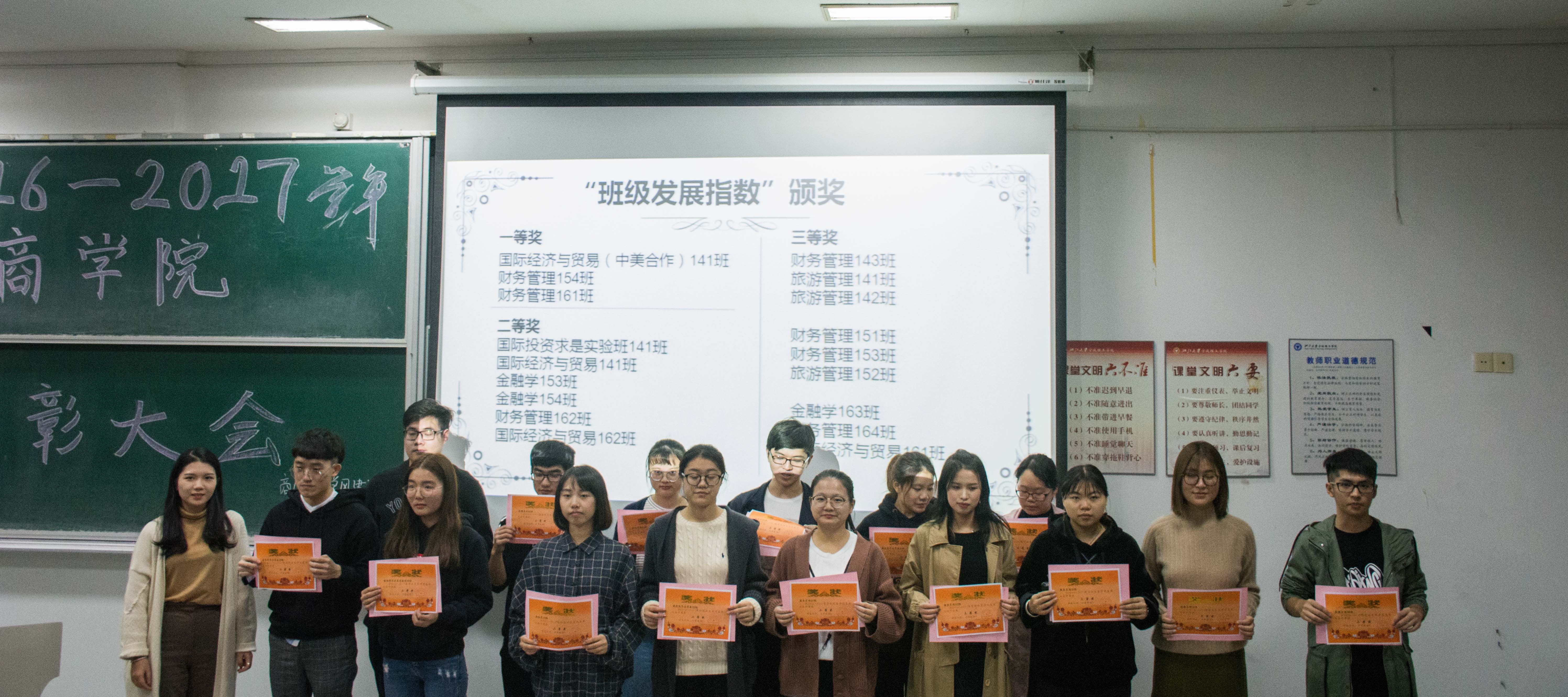 三等奖:财务管理143班、旅游管理141班、旅游管理142班、财务管理151班、财务管理153班、旅游管理152班、金融学163班、财务管理164班、国际经济与贸易161班。