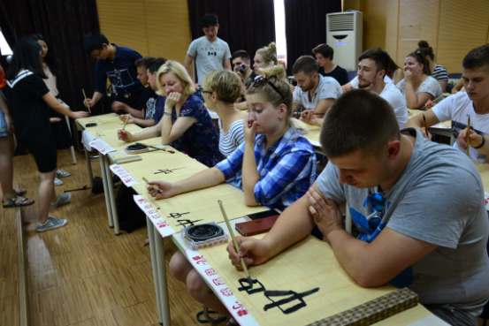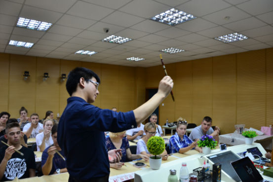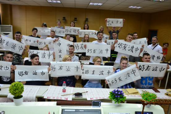 随后,陈老师教波兰同学们如何握笔,怎样蘸墨水以及书写笔画顺序。陈老师挥动手中的毛笔,行云流水般写下了“中波友好”四字,顿笔之时,引得波兰职工一阵欢呼。讲解完毕,波兰职工们跃跃欲试,十分专注地开始一笔一划模仿着写。志愿者们热心地指导职工们的握笔姿势、坐姿,波兰职工们渐渐掌握了书写方法,越写越好。