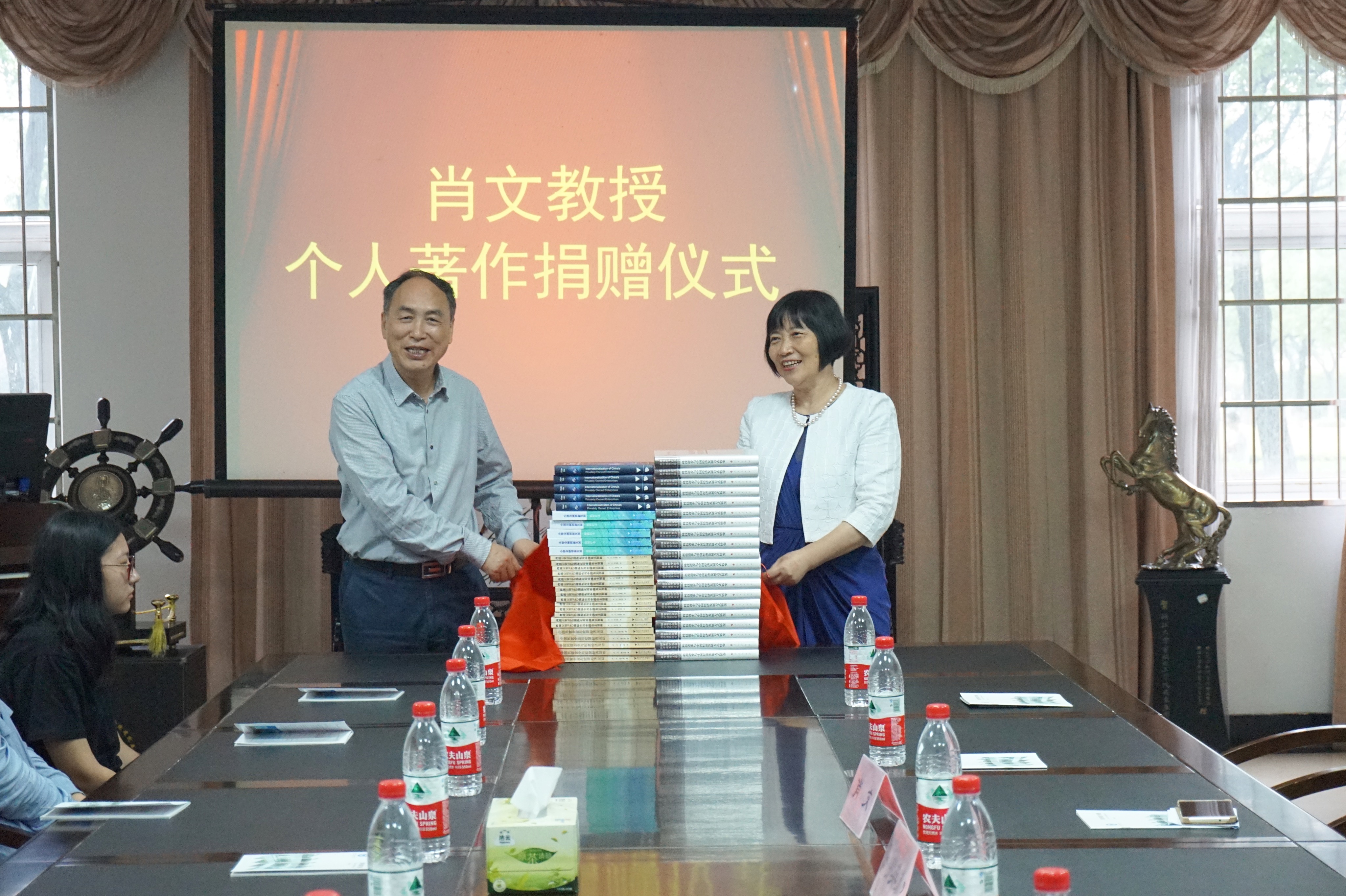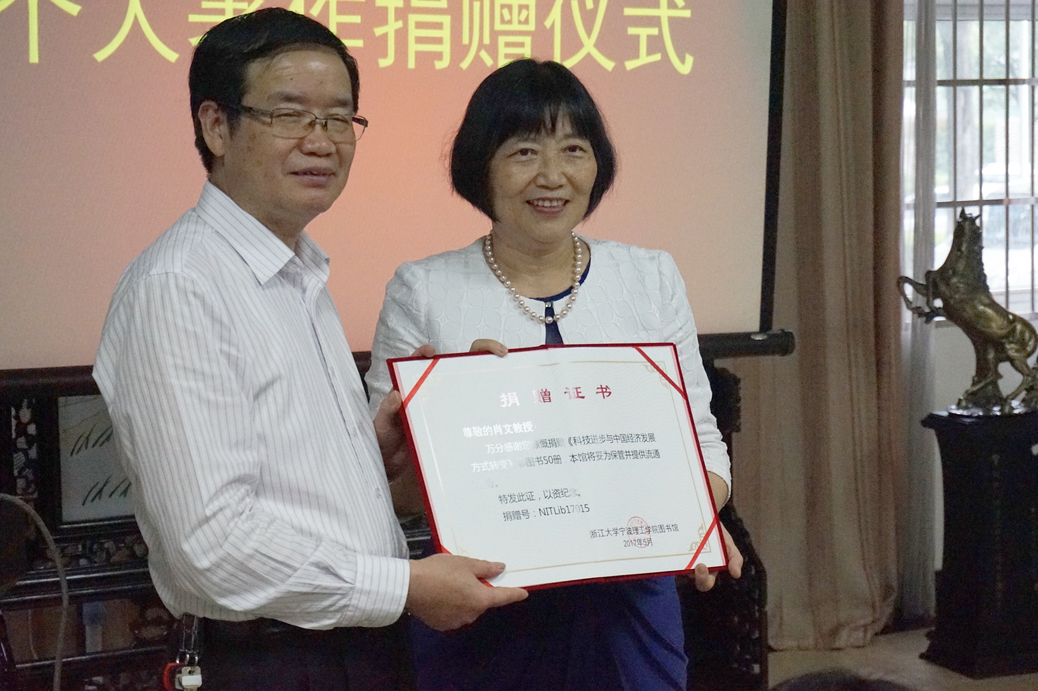 仪式开始前,肖文教授与赵继海馆长就读书写作相谈甚欢,气氛融洽。而后仪式正式开始,刘杰老师先介绍了公司图书馆近年图书捐助情况,并感谢肖文教授此次捐助行为。赵继海馆长重点的介绍了肖文教授所担任的职务和学术履历与成就,并再次对肖文教授表示感谢。随后,费英勤书记与肖文教授共同为捐赠图书揭幕,全场掌声热烈。紧接着,赵继海馆长代表图书馆向肖文教授颁发了精心制作的捐赠证书并合影留念。金融164班沈程程同学还为到场师生朗诵了《跨国公司R&D国际化与中国自主创新》前言。