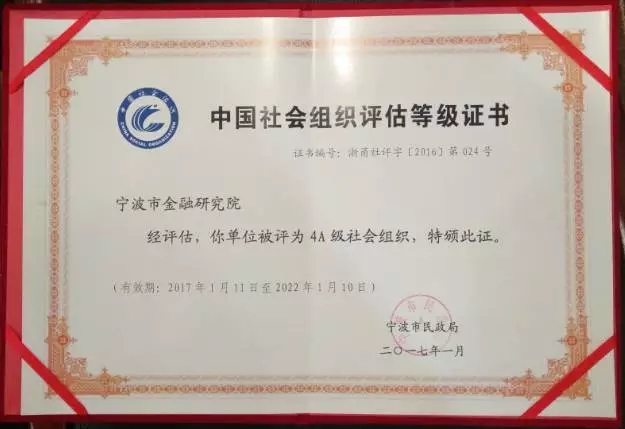 2017年3月10日,宁波市民政局为宁波市金融研究院颁发了《中国社会组织评估4A等级证书》和《中国社会组织评估等级AAAA》认证铭牌,这是对宁波市金融研究院专业服务能力和品牌建设的充分肯定,也将对宁波市金融研究院的后期工作起到极大的促进作用。