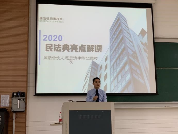 党员大会结束后,yl23411永利官网登录李萍萍书记聚焦全国两会为全体党员进行了党课授讲,传达了2020年全国两会精神。2011届员工嵇思涛律师为大家宣讲民法典,他为在座党员进行了2020年民法典的亮点解读,并从一些生活中的小事讲解了一些比较日常的法律问题和法律知识。