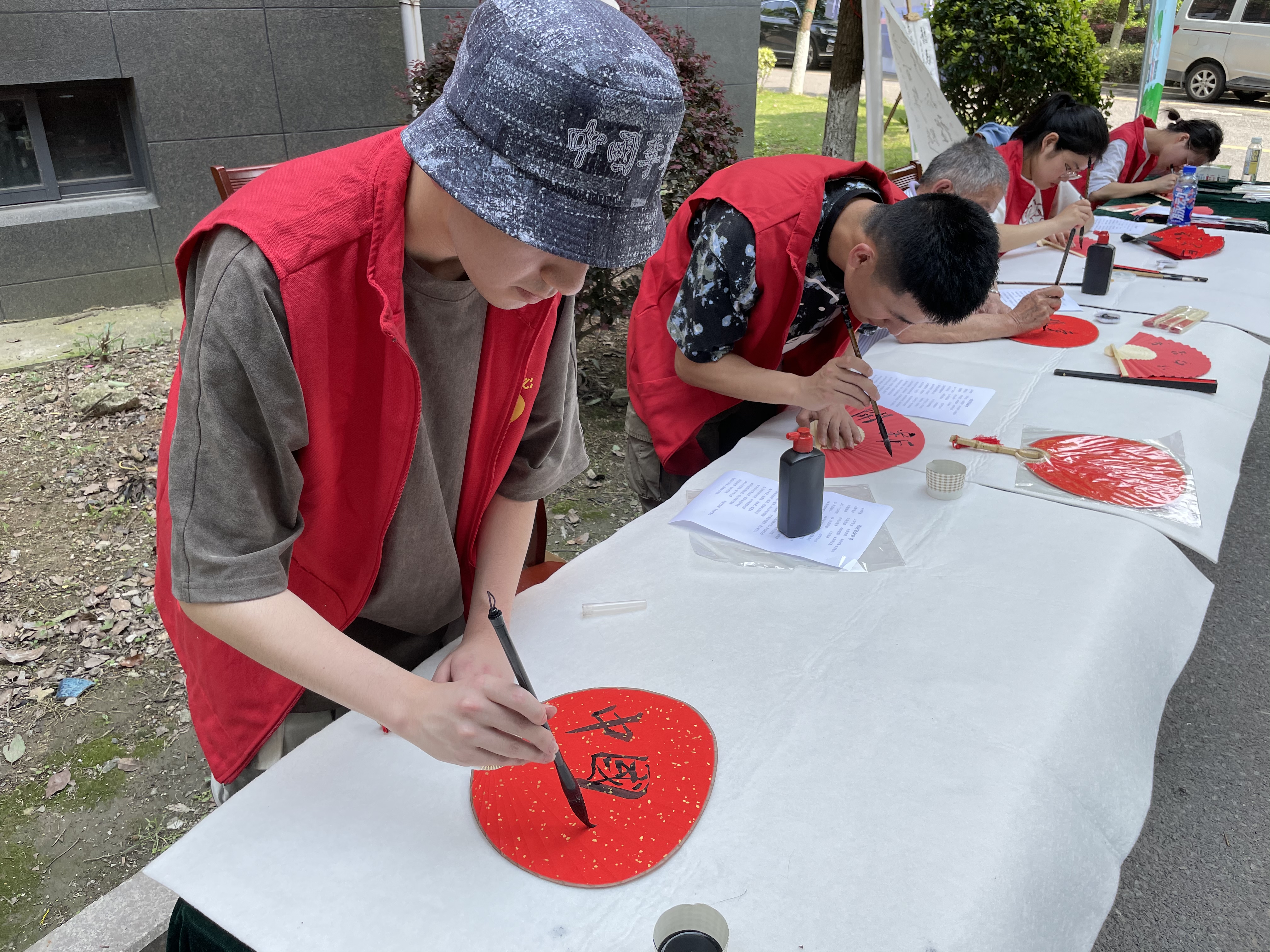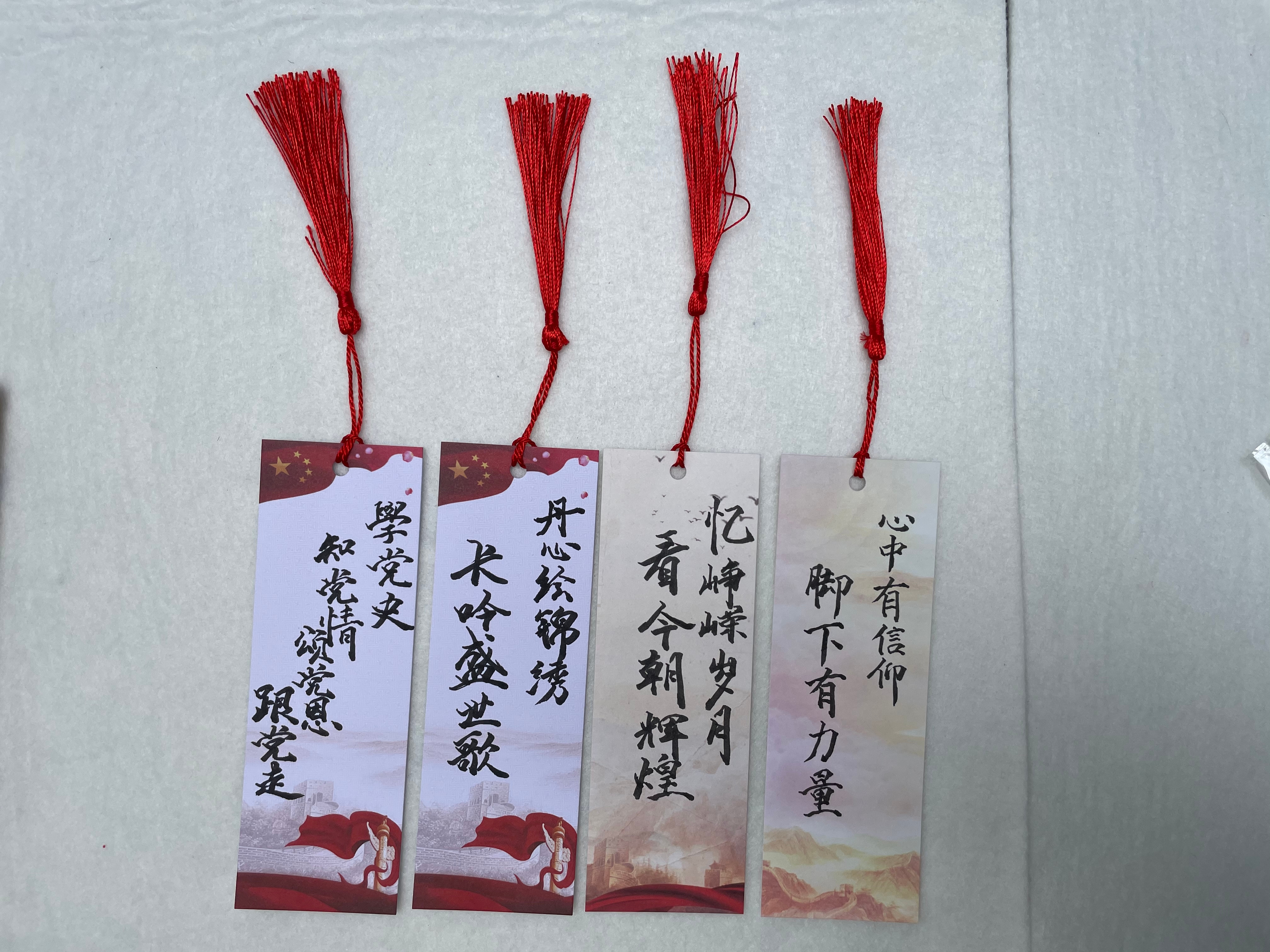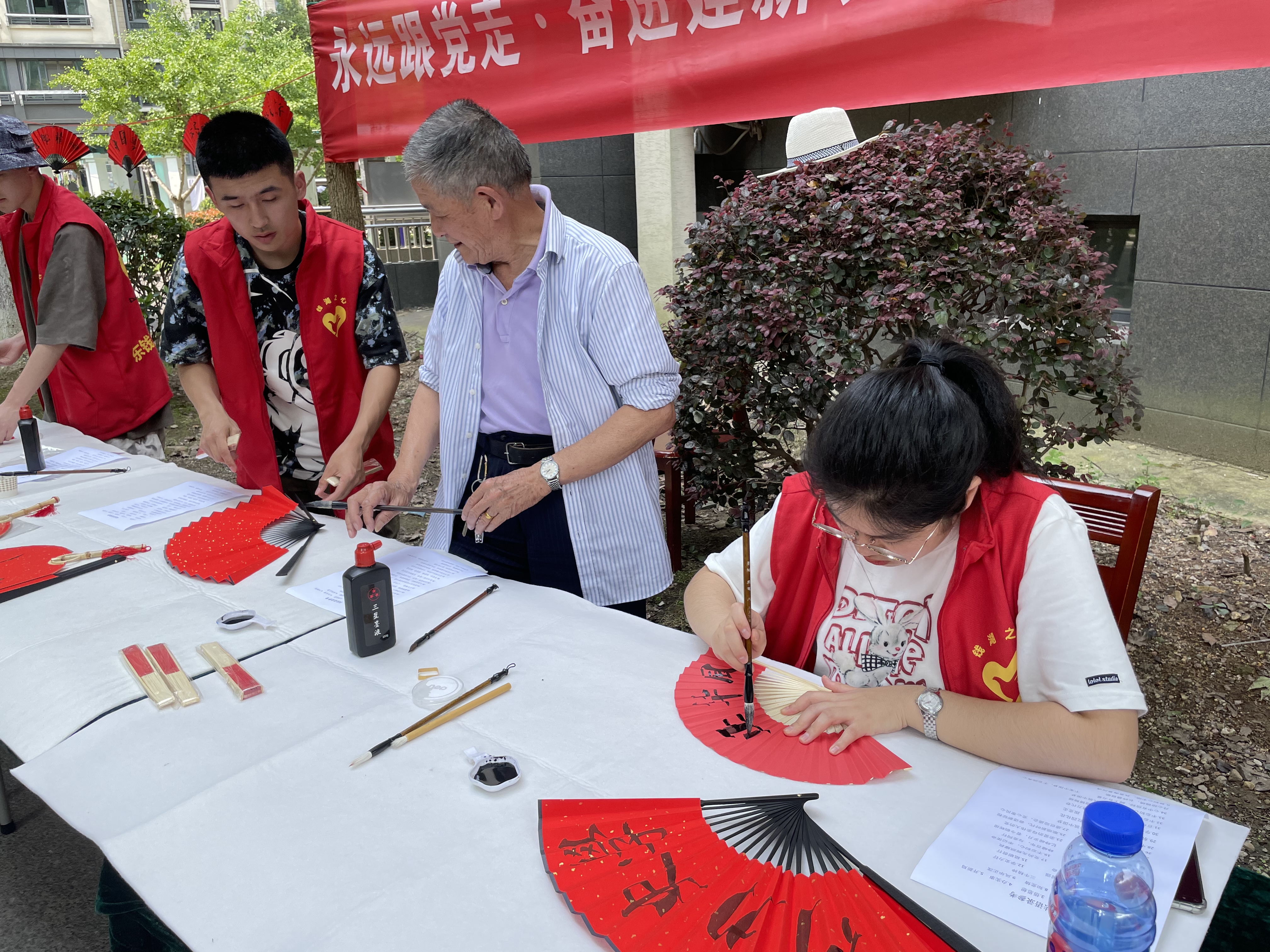 第二部分,员工与社区老党员以建党100周年以来国家、社会、公民生活的变化、中国共产党员难能可贵的精神为主题,共同在扇面上题字,并制作书签。