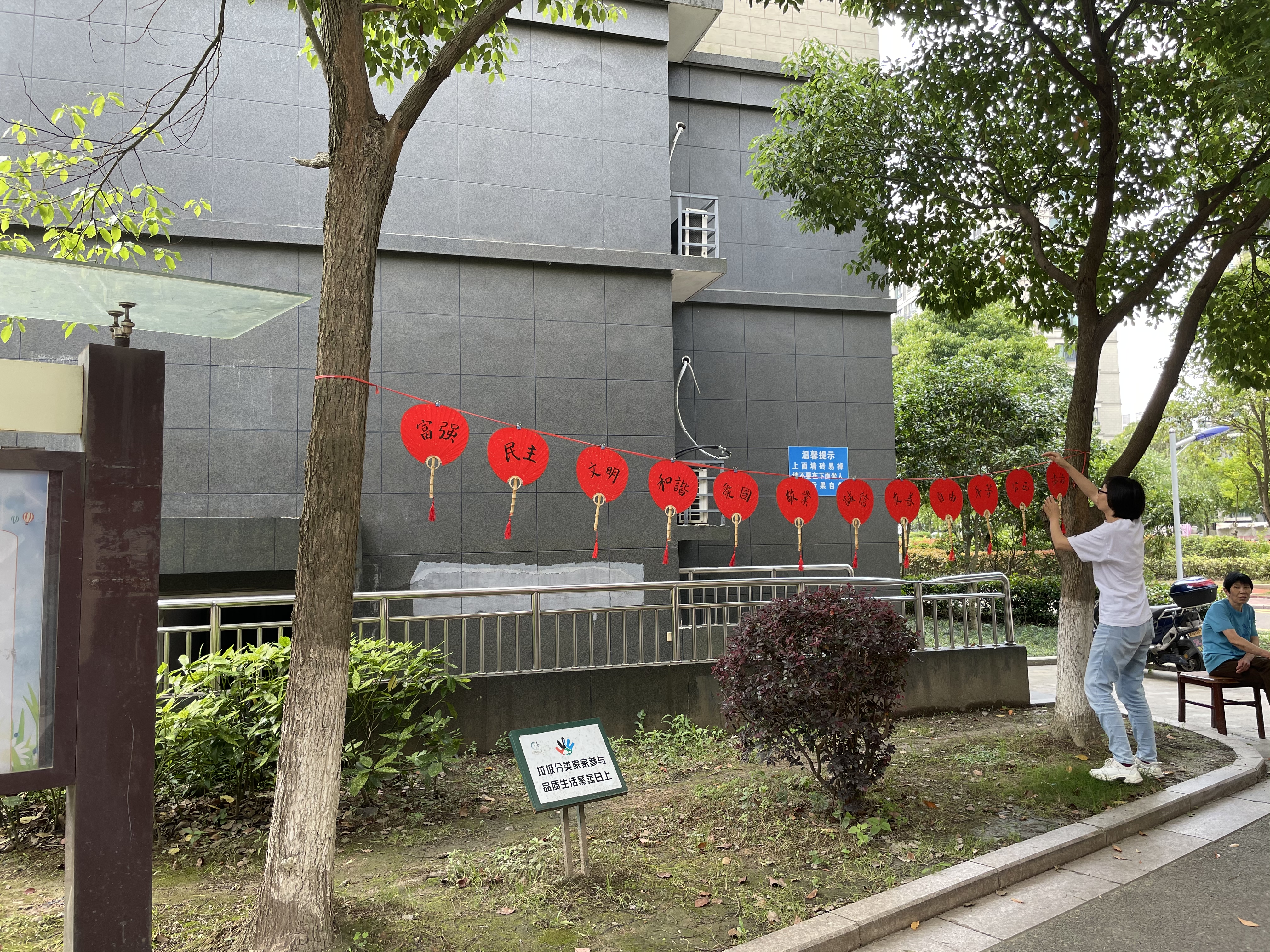 第一部分,员工党员帮助居委会进行场地装饰,竖立垃圾分类宣传立牌、悬挂社会主义核心价值观的竹扇。