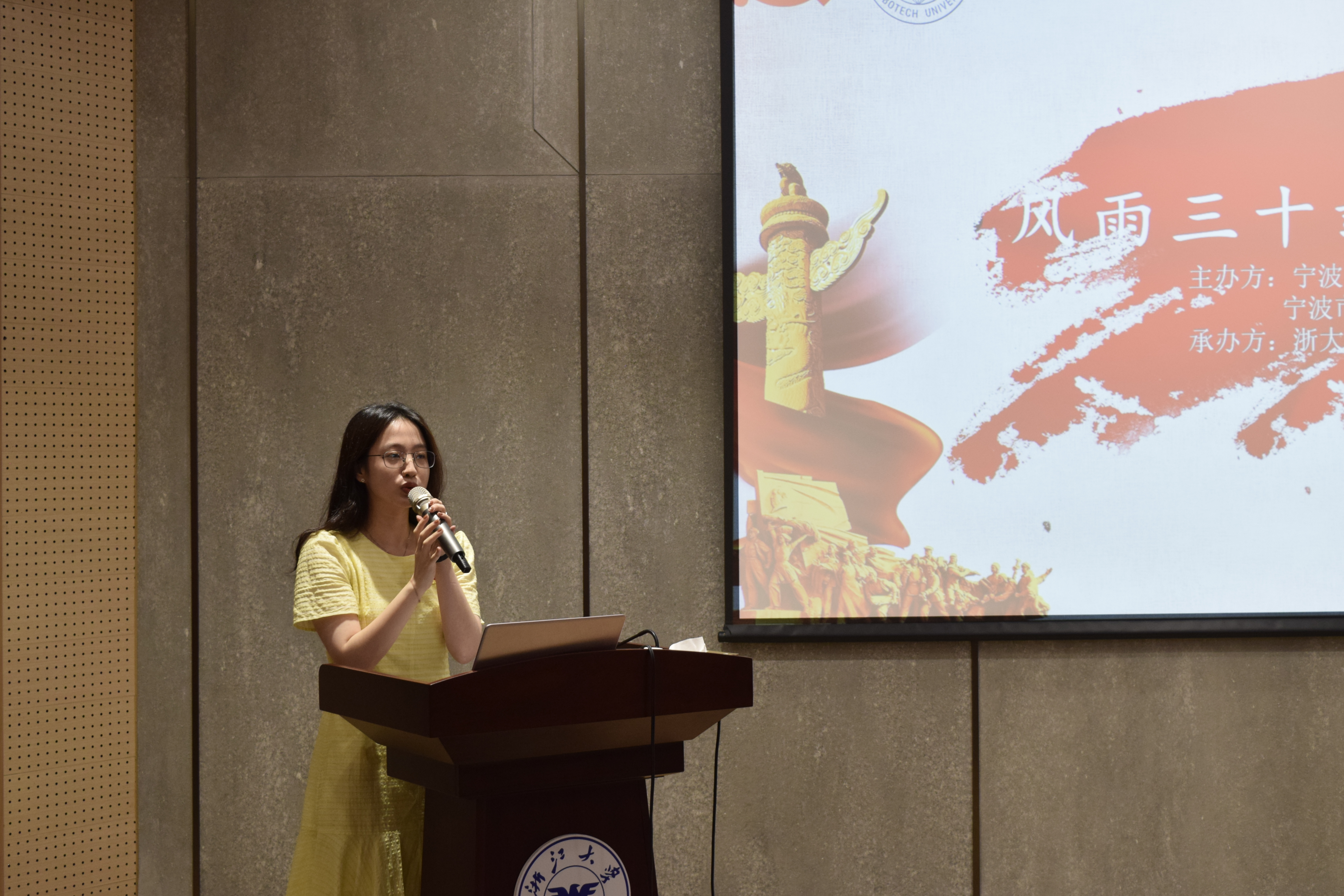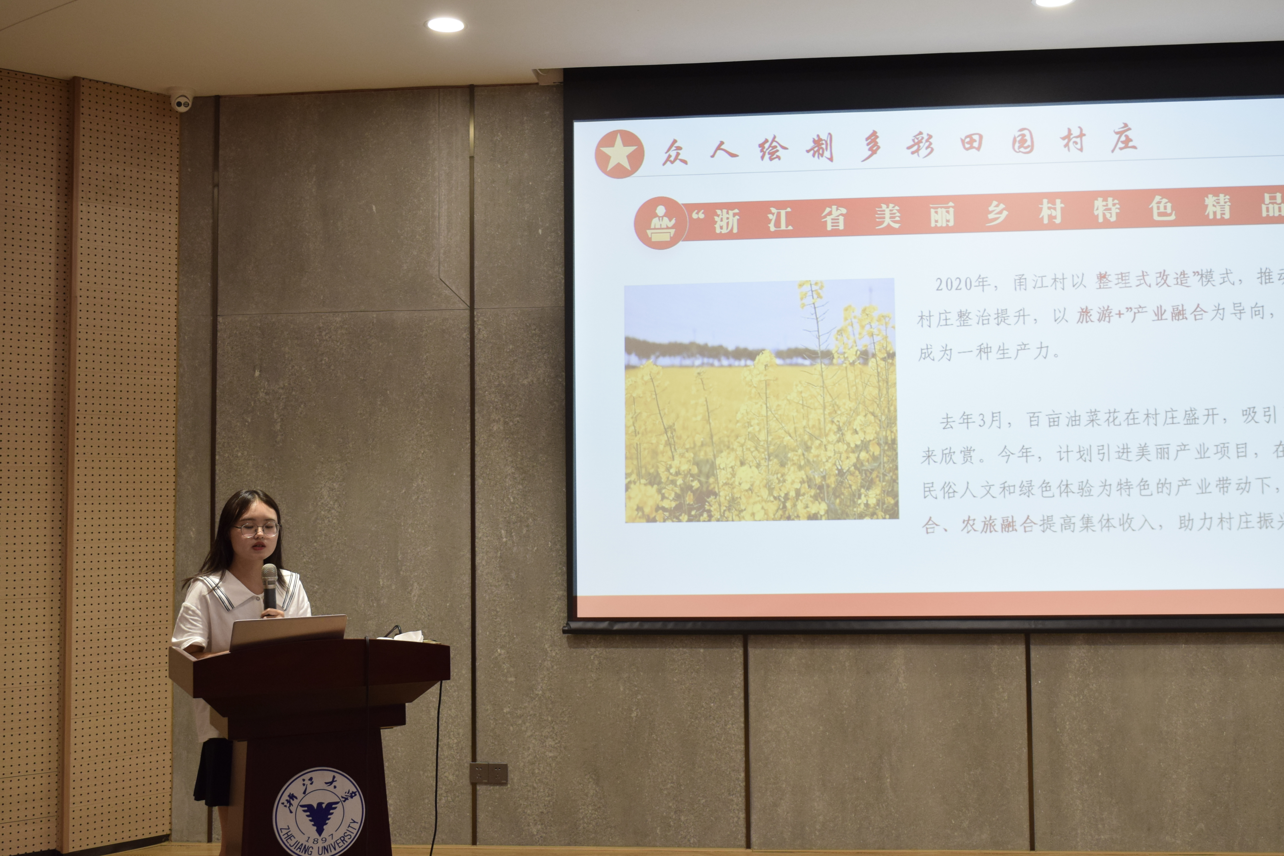 陈怡,陈静汶分别以《美丽甬江人人共创,甬江致富人人共享》《风雨三十载,湾底致富路》为题,从暑期实践经历为出发点,讲述了甬江村和湾底村的发展道路,呼吁同学们积极响应号召,为实现共同富裕不断努力奋斗。