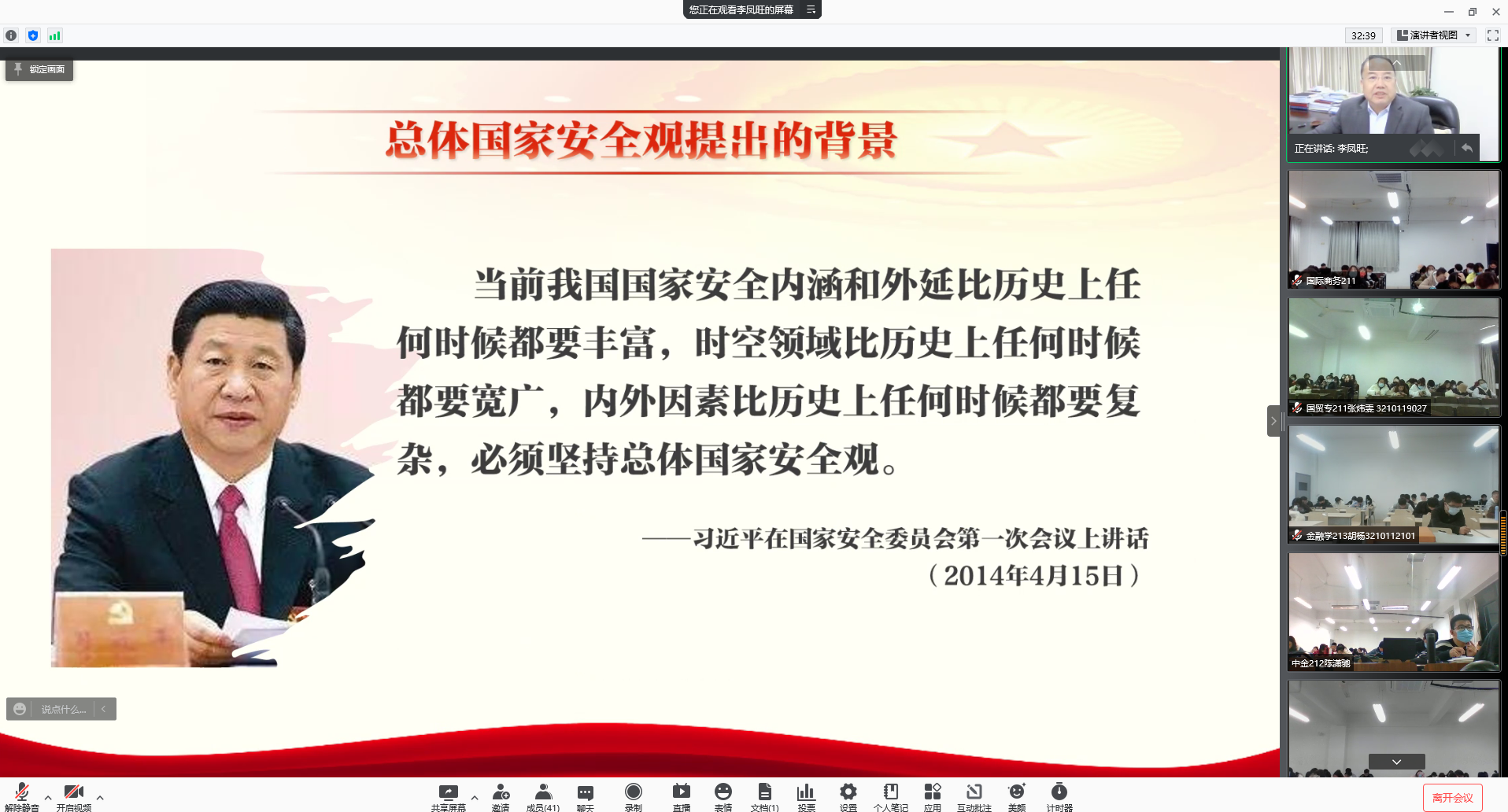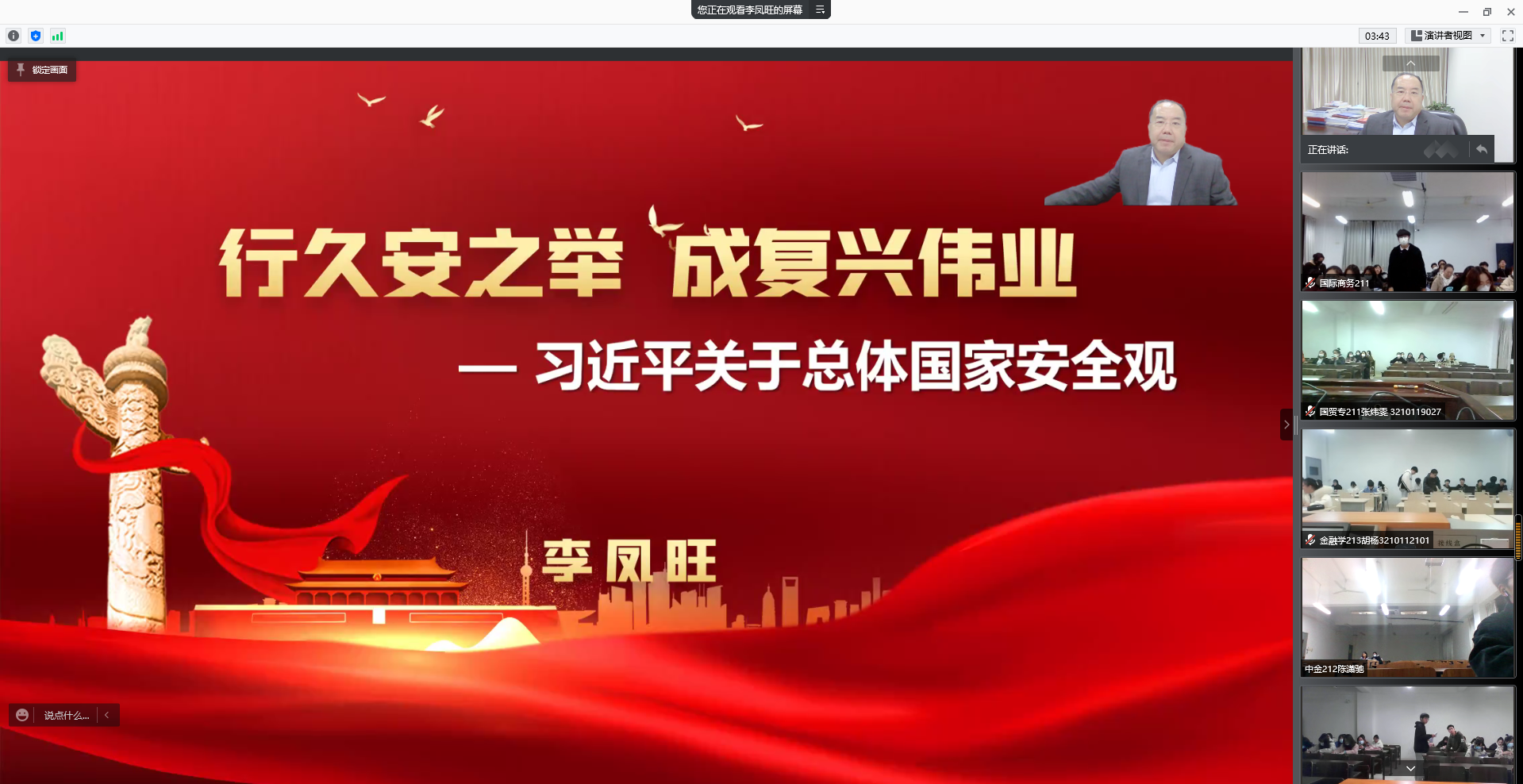 “无危则安,无缺则全”,国家安全是安邦定国的重要基石。李凤旺副书记以深厚的理论底蕴、生动风趣的授课方式,从国家安全观的要义、历史演变过程以及我国在发展过程中所面临的国家安全问题等几个方面解读了国家安全的内涵,分析了国家当前面临的安全环境。