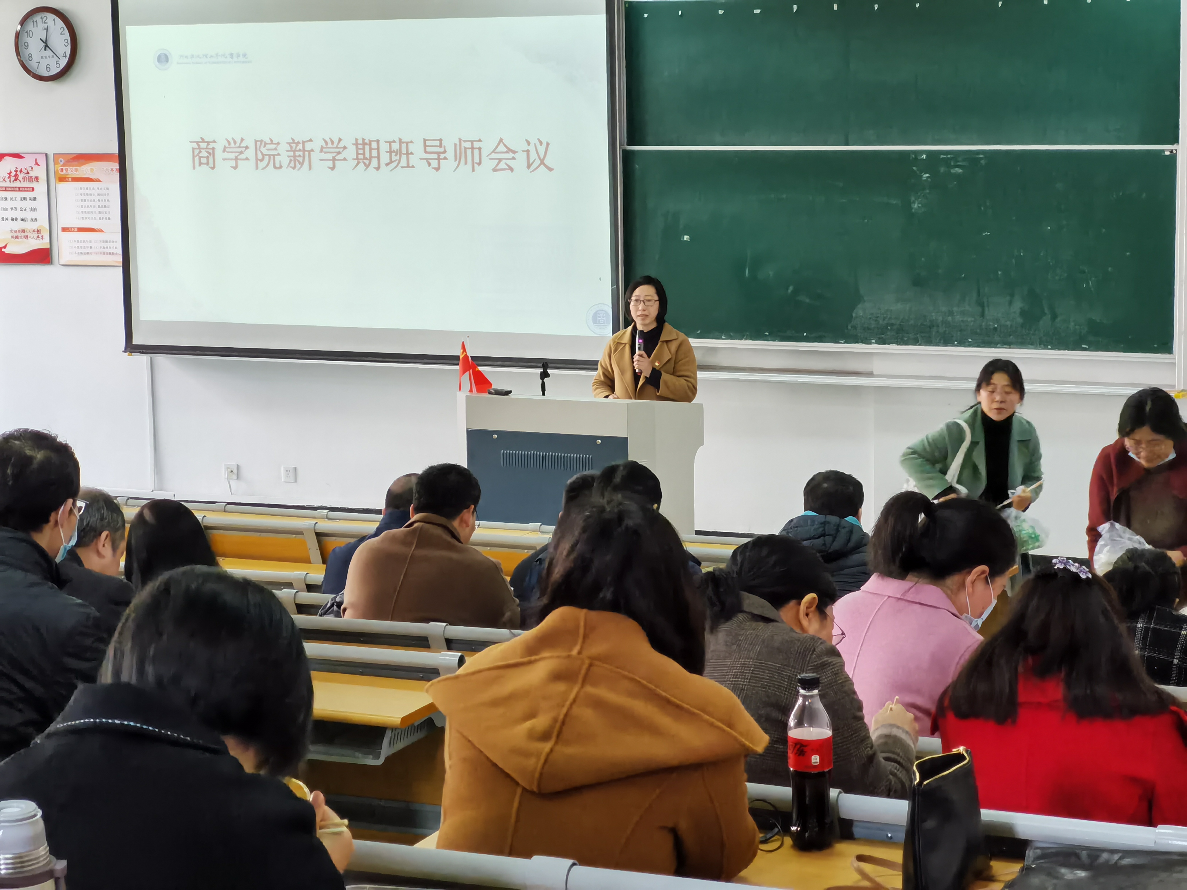吴琼老师针对上学期员工总体学风、安全、就业、考研以及疫情排查等情况进行了详细说明,总结了上学期工作的不足之处以及新学期开展员工工作的计划与目标。