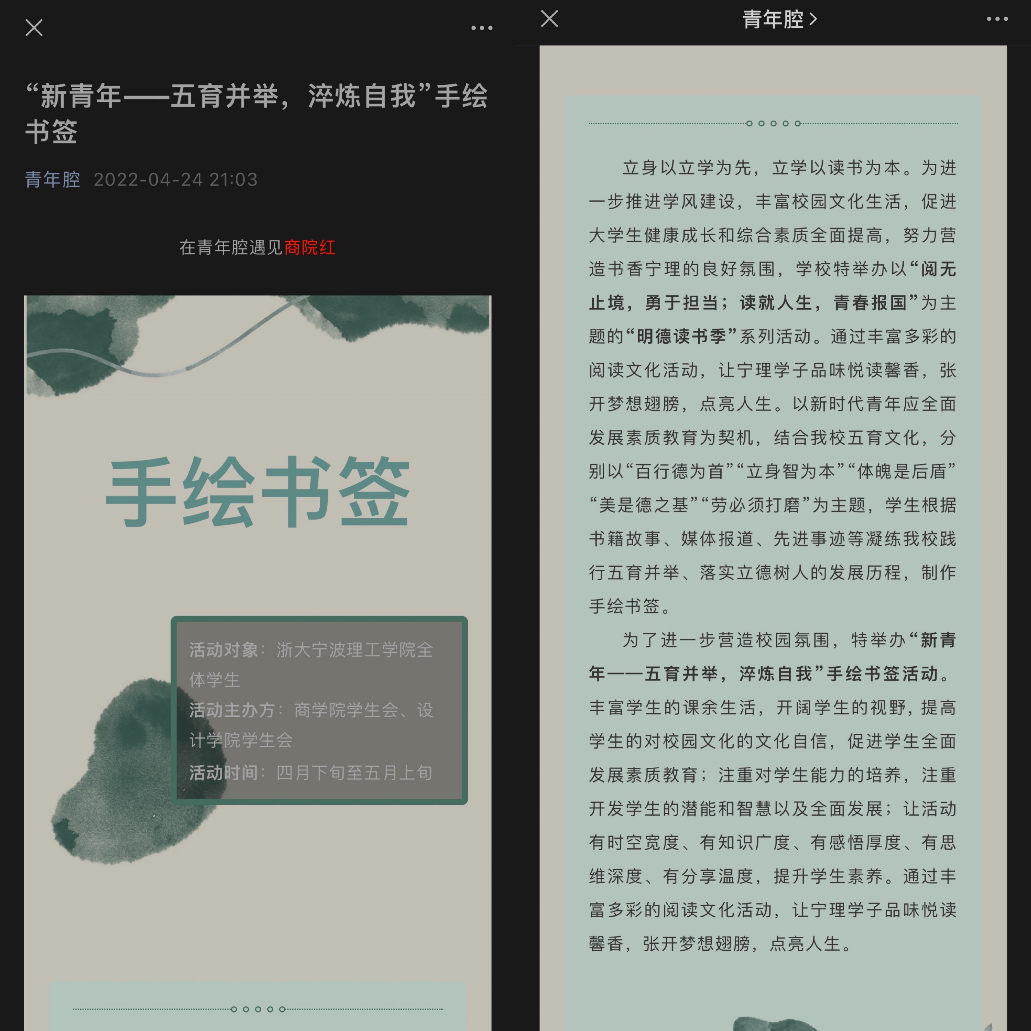 本次活动丰富了同学们的课余生活,提高同学们对校园文化的深入了解。手绘的形式让活动有时空宽度、有知识广度、有感悟厚度、有思维深度、有分享温度。此次手绘书签活动,让浙大宁理学子品味悦读馨香,张开梦想翅膀,点亮精彩人生。