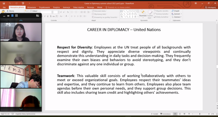 2022年7月15日下午5点,yl23411永利官网登录2022年波兰华沙大学暑期线上访学项目圆满结束。宁理学子在短短十天里,通过语言学习、专题讲授、主题讨论、小组汇报等环节,逐渐熟悉了欧洲大学的教学模式。同学们在互动讨论中自信地表达,得到了波兰外教老师们的肯定。中方教师在做好团队管理工作的同时,加强与外方教授的沟通,及时反馈同学们在访学过程中遇到的问题,推进项目顺利进行。