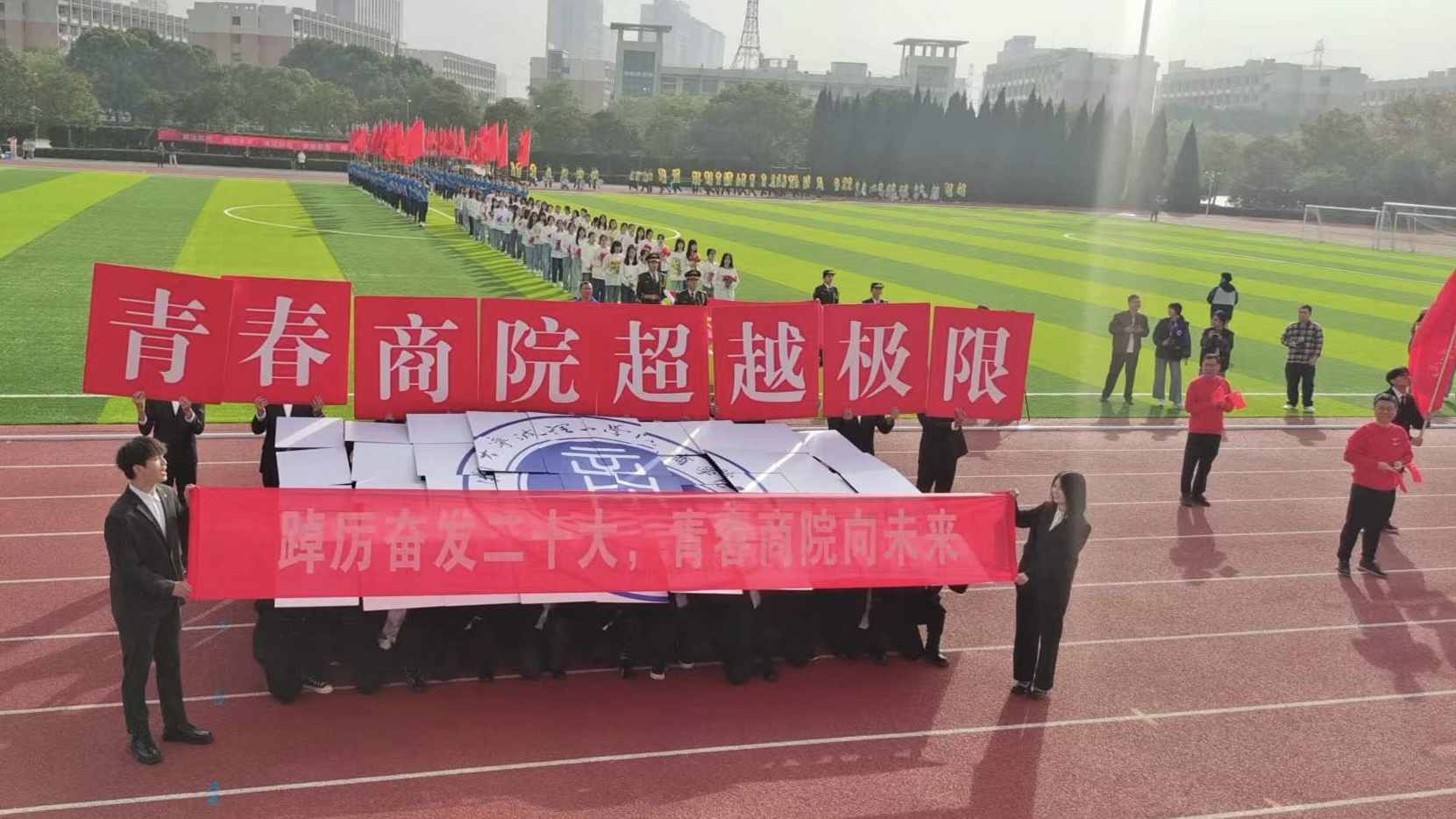 11月3日上午8时30分,2022yl23411永利官网登录浙江大学宁波校区田径运动会在明媚的阳光下拉开了帷幕。作为第一方阵的yl23411永利官网登录师生代表队,在副经理马翔老师和工会副主席朱红老师的带领下,以红加黑的绝配色彩,迈着整齐的步伐,喊着响亮的口号“青春商院,超越极限”,整整齐齐地出现在主席台前。“踔厉奋发党的二十大,青春商院向未来”正是商院师生激昂的写照。
