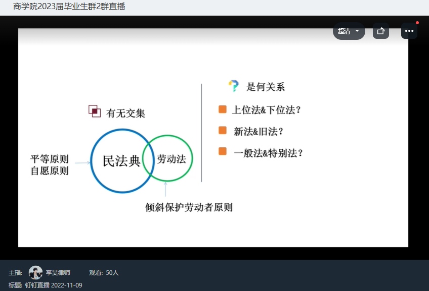 李昊律师围绕老员工就业基本权益保障的主题,其内容主要包括自由实习权、自主择业权、平等就业权、休息休假权、违约求偿权、维权路径这六大方面,通过典型案例分析,揭示就业“陷阱”,增强了同学们的防范意识。