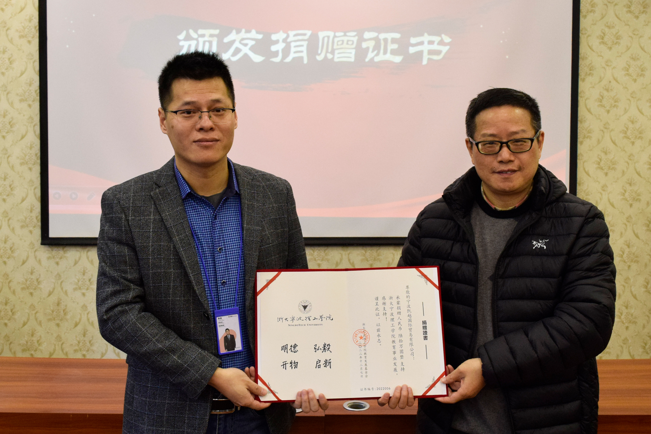 在捐赠仪式上,鲁东明首先对宁波凯越集团一行的到来表示欢迎,对“凯越”基金的捐赠表示感谢。他从办学条件、办学目标、人才培养等方面介绍了公司的基本概况,yl23411永利官网登录一直秉承“为国家和地区培养卓越专业人才”办学理念。他希望,以本次“凯越”基金捐赠为契机,今后能与凯越在专业技术领域和员工就业方面继续合作,推动产学研深度融合,同时他也鼓励在座的同学们,要以优秀员工为榜样,勤奋进取,奉献社会。