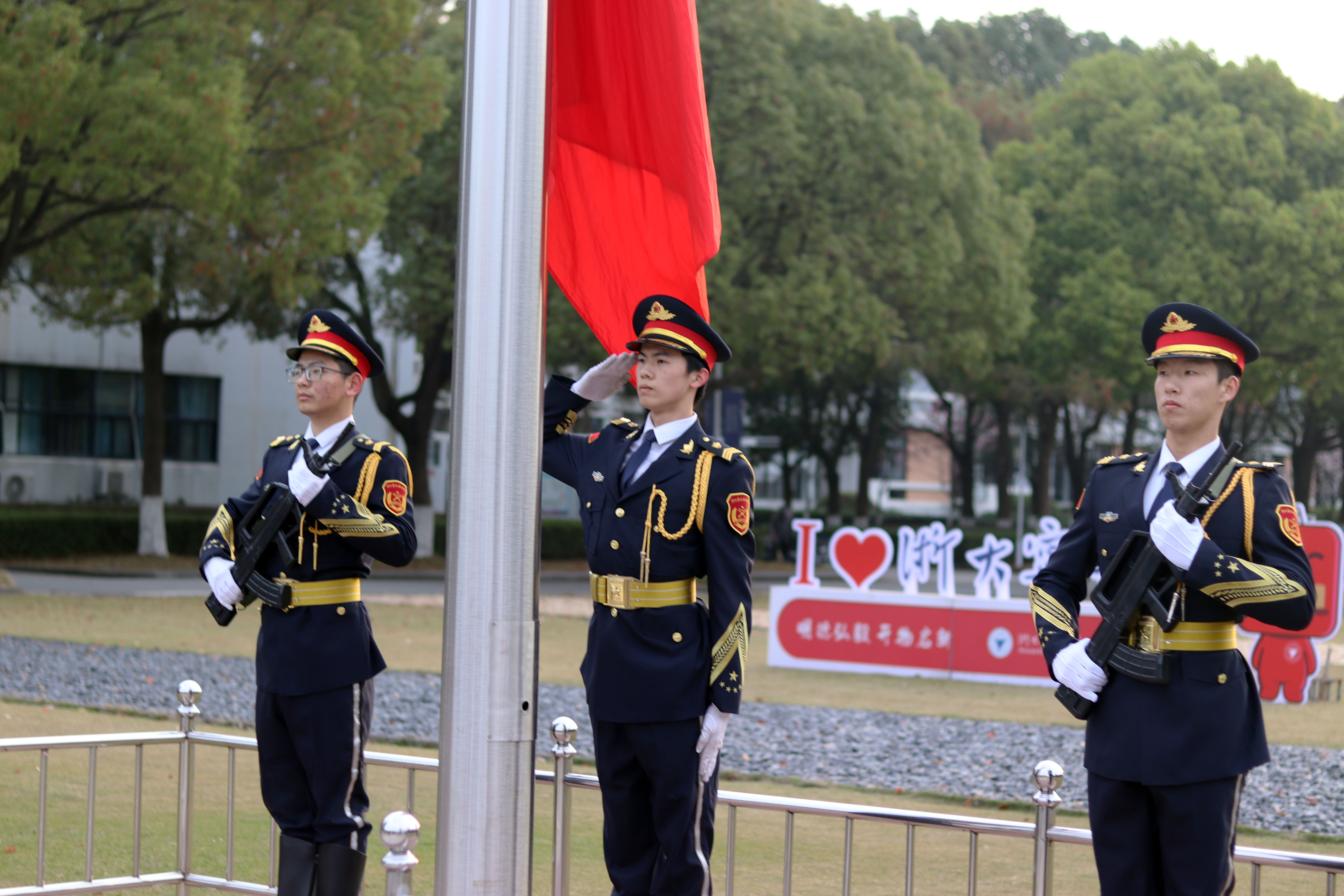 “升国旗,奏国歌,行注目礼!”国旗护卫队迈着矫健整齐的步伐护送五星红旗进场。伴随着嘹亮的歌声,五星红旗在理工校园冉冉升起。