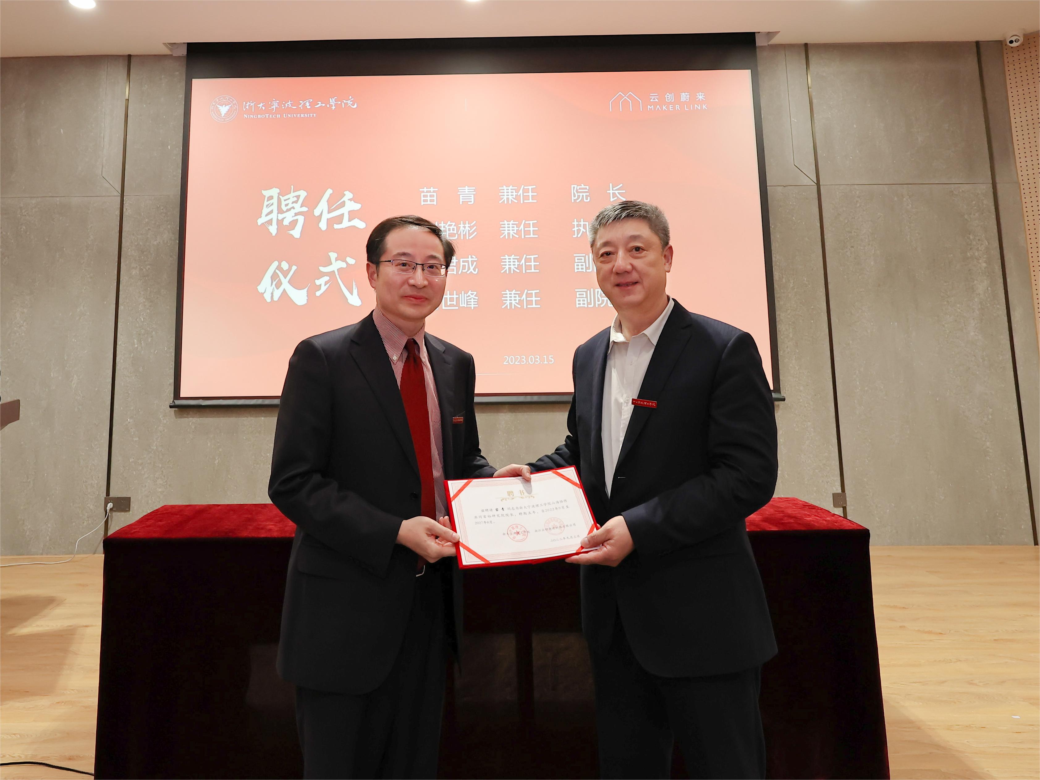 随后,浙大宁波理工公司党委书记胡征宇、副书记冯建波宣读研究院经理、副经理名单并颁发聘书,聘任yl23411永利官网登录经理、教育部青年长江学者苗青教授为经理,聘任yl23411永利官网登录副经理刘艳彬教授为执行经理,浙江云创浙理科技副总经理杜君成以及yl23411永利官网登录培训中心主任刘世峰为副经理。