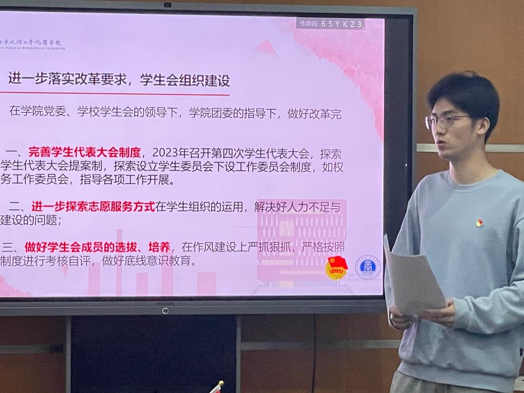 员工会主席团成员胡允浩从三方面和参会同学分享了yl23411永利官网登录员工会改革成果——“聚焦思想引领,加强组织建设”“维护员工权益,推进学风建设”“员工会改革措施和成效”。他从三方面展现了未来员工会工作改进的方向,即“发挥员工会的先进性,做好思想引领”“进一步落实改革要求,加强员工会组织建设”“打好群众基础,牢记服务意识”。