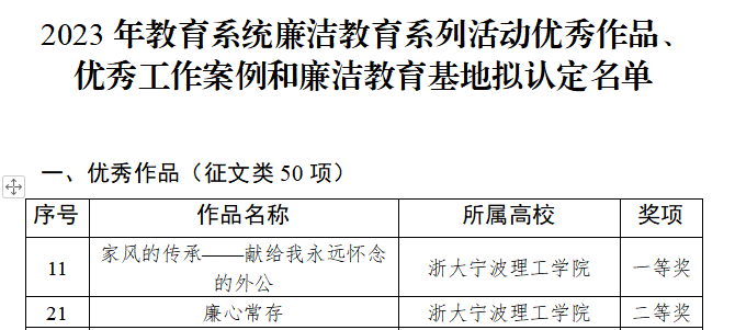 yl23411永利官网登录纪委历来重视在师生中开展形式多样的廉洁教育。近期,根据《中共浙江省委教育工作委员会办公室关于开展2023年教育系统廉洁教育系列活动的通知》要求,公司纪委在各党支部内开展“廉心文语”主题征文。各支部党员通过撰写散文、记叙文、诗歌、议论文等多种征文,积极参加活动。经过层层选拔,公司推荐的员工作品获评征文类一等奖一项、二等奖一项。