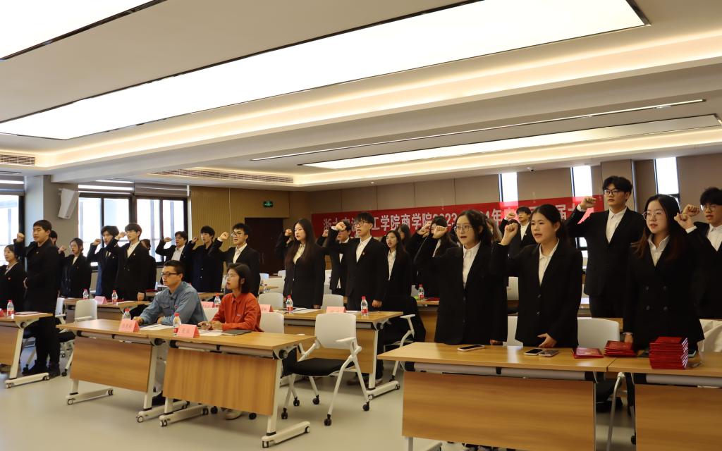 紧接着,庄严的社团廉洁奉献宣誓在朱富莎同学的领誓下开始。社团廉洁奉献宣誓紧紧围绕“廉洁奉献”这一主题,强调了社团各部门应服务商院、踏实工作。宣誓庄重而热忱,提高了社团工作的向心力与责任心。