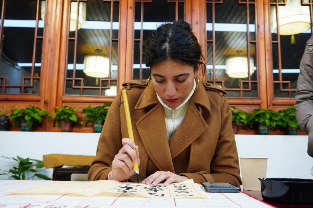 随后,国际生们来到了阳明学堂体验书法。他们尝试临摹自己喜欢的汉字,一笔一划地写下“冬至快乐”的祝福。而后国际生们换上了汉服,合影留念。他们表示,汉服真的太漂亮了。通过亲身体验,国际员工们深刻感受到了中国书法艺术的魅力,也对中华古代传统文化有了更深入的了解。