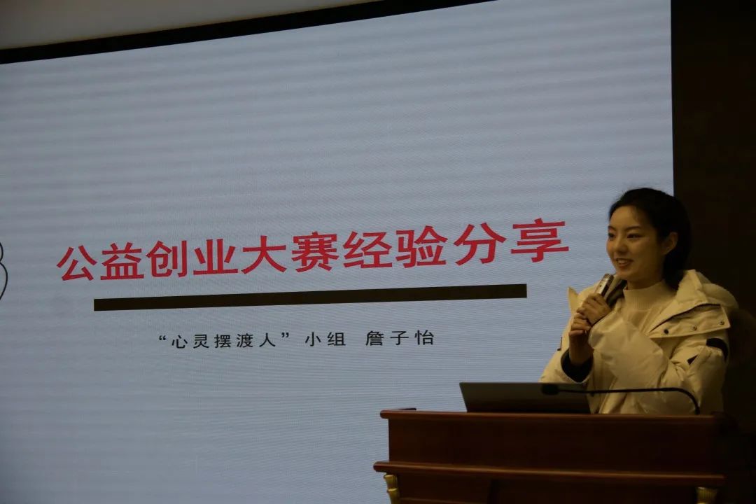 往届参赛选手詹子怡分享大赛经验。她向大家分享了自己和公益创业的故事,言明了团队协作与团队沟通的重要性。同时,表达了在创业过程中良好的团队文化与团队氛围对团队进步的重要性,传递了团队对于项目未来预期进展规划的必要性。