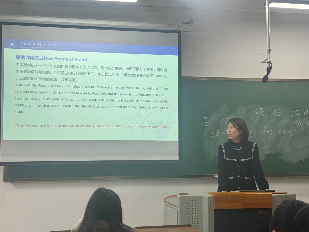 班会首先组织员工进行消防公开课视频的观看,着重向他们介绍了遇到宿舍火灾该如何正确逃生。通过实际案例的分析,国际生们对消防安全知识有了更加深入的了解,并意识到在日常生活中要时刻注意火灾的预防。接着,向国际生们介绍了几种新型电信诈骗的案例,传授了识别和防范诈骗的方法,提醒国际生们要保持警惕,不轻信陌生信息,并及时向辅导员或班导师报告可疑情况。之后,向国际生介绍了校内安全使用电动自行车的“九个不要”和“六个必须”原则。提醒国际生们在校园内外要注意交通安全,避免发生交通事故。
