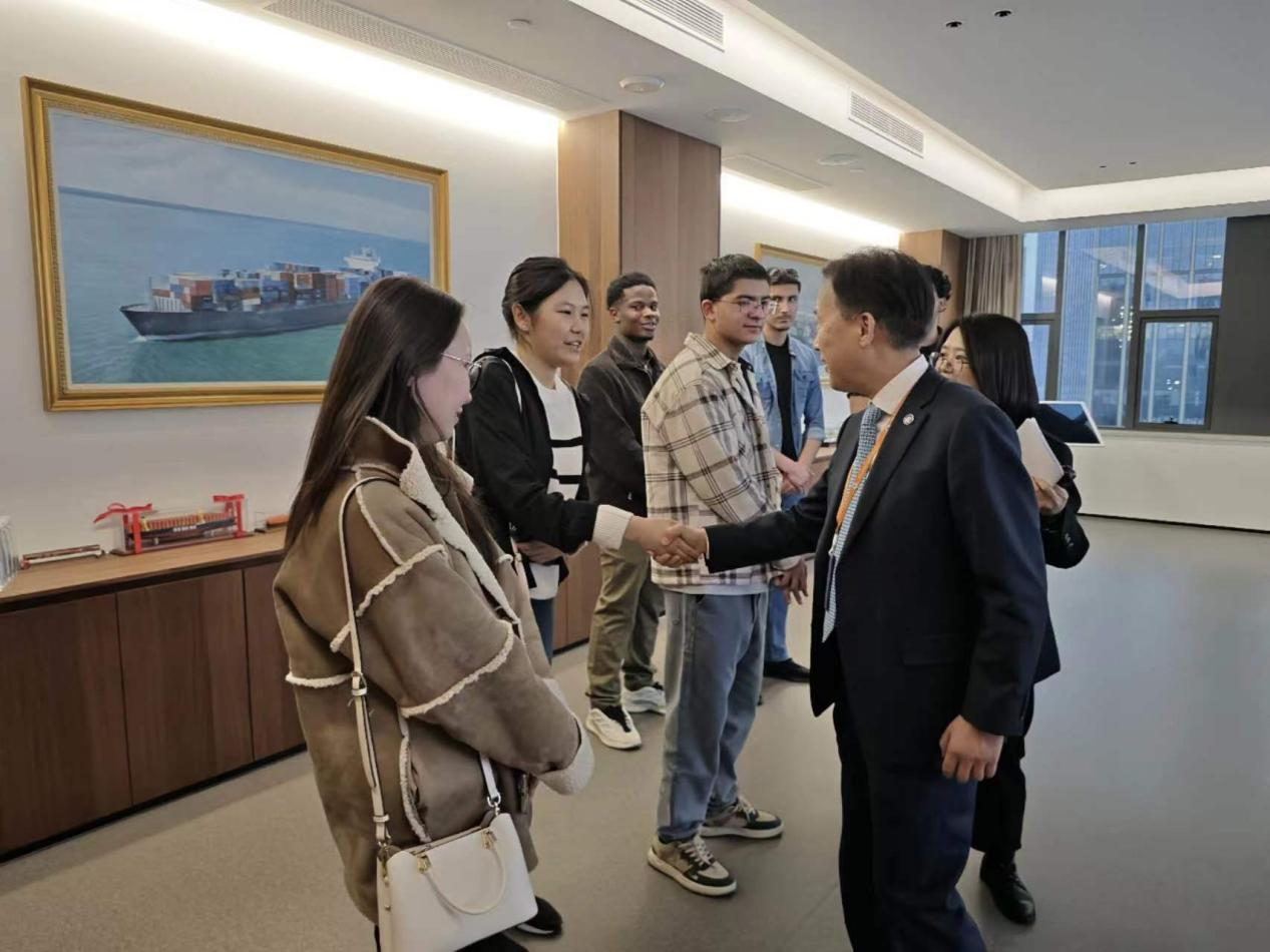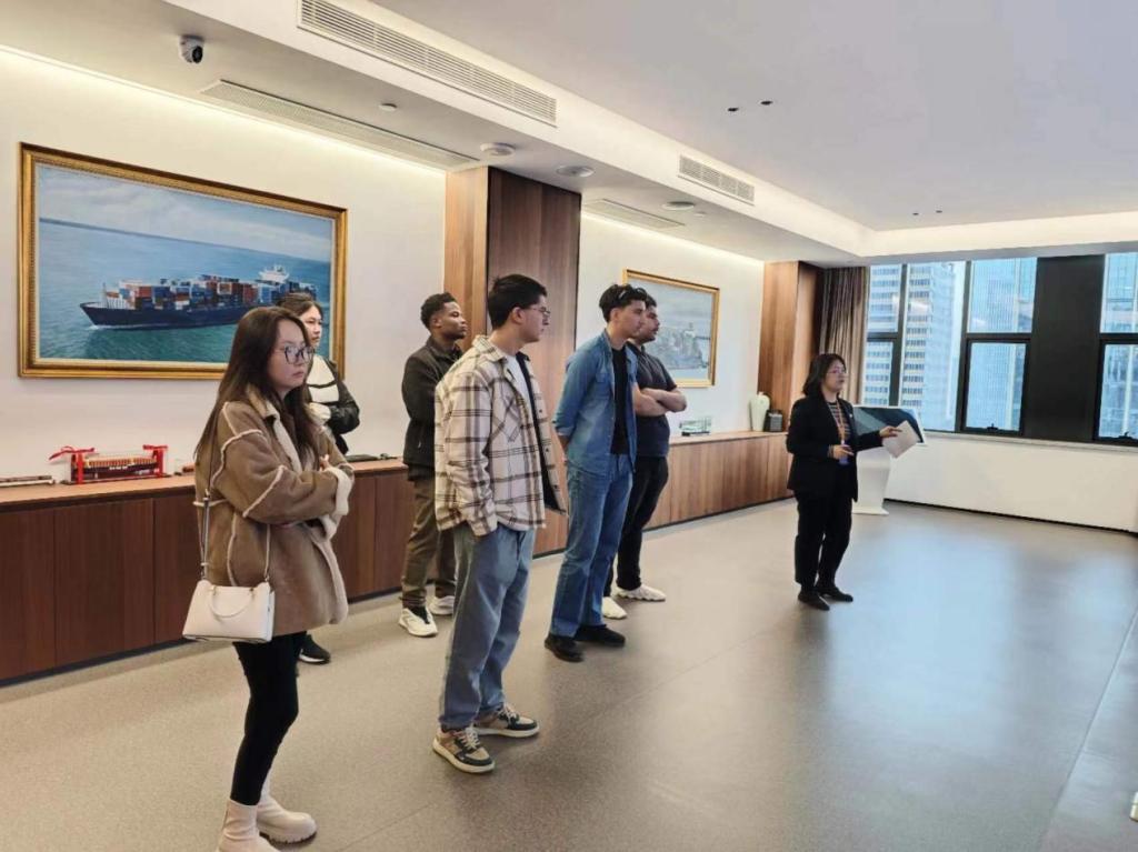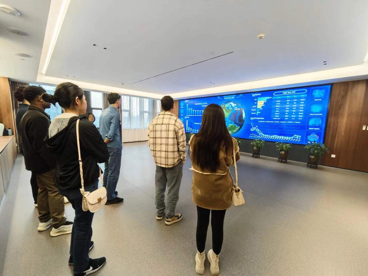 活动开始,东南物流集团党群办副主任徐阳芳首先在企业智能大屏前为同学们详细介绍了公司经营概况、营收情况、业内排名以及企业运营的陆运航线、海运航线。同时,她还展示了数字化实时更新的运输大屏,所有航线上的船只、火车、货车都会实时显示在大屏上。这一环节让国际生们对我国物流行业的管理模式和数字化运营有了更加直观的认识。值得一提的是,在此次活动中,员工们有幸见到了东南物流的创始人贾骏董事长。贾董亲切地与员工们打了招呼并握手,让国际生们感受到了企业的热情和友好。