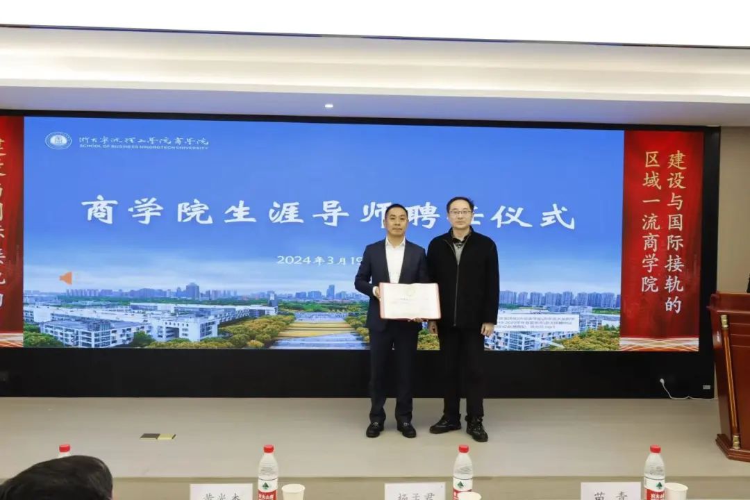 讲座结束,苗青经理向同学们总结了杨董事长创业成功的秘诀,发出了用专业知识赋能企业发展的倡议。最后,苗青经理为杨董事长颁发了“生涯导师”的聘书。