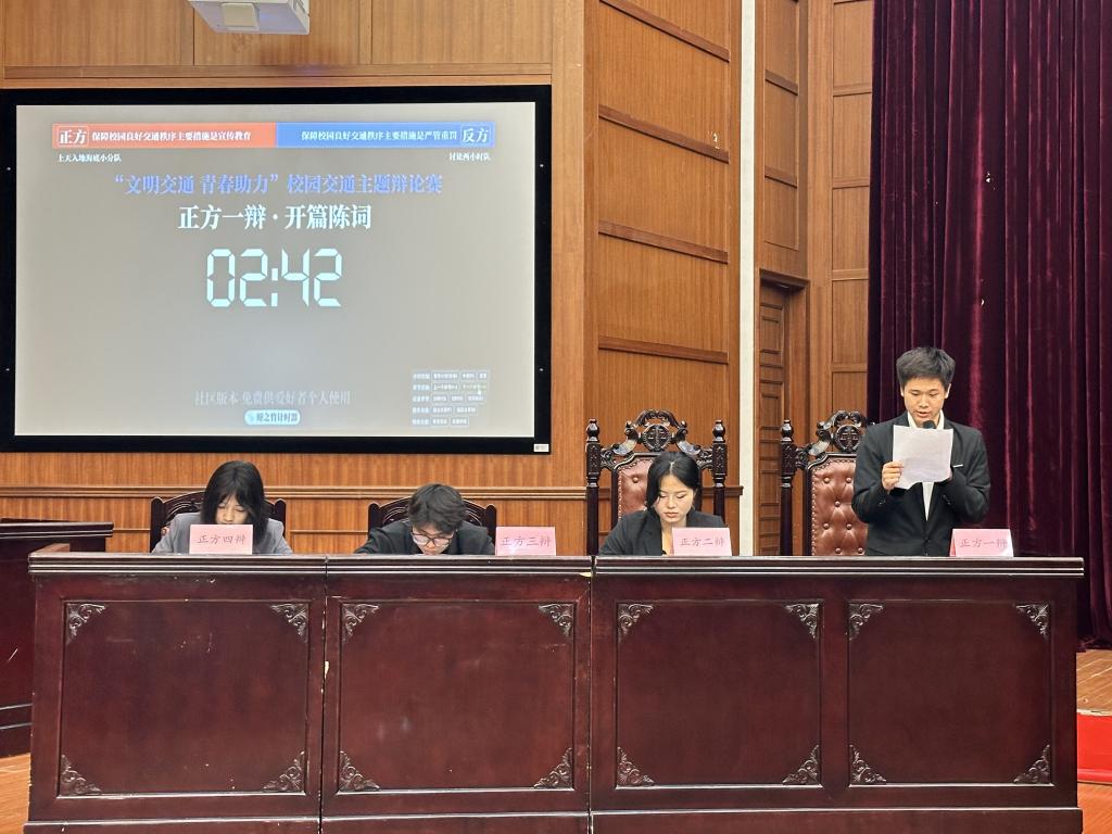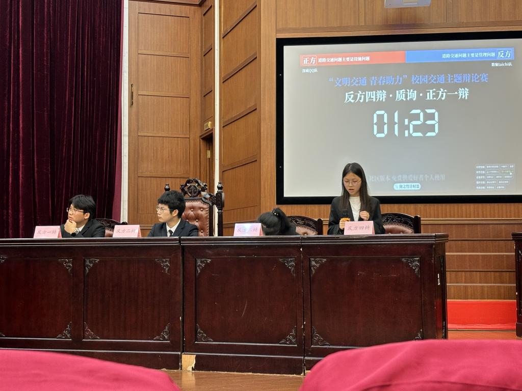 辩论赛分别以“保障校园良好交通秩序主题措施是宣传教育还是严管重罚”“道路交通问题主要是设施问题还是管理问题”为辩题,正反双方围绕该主题展开了激烈交锋。
