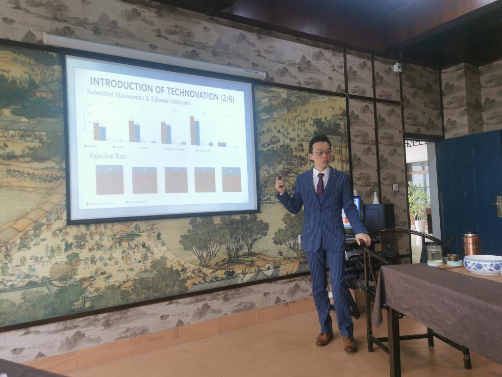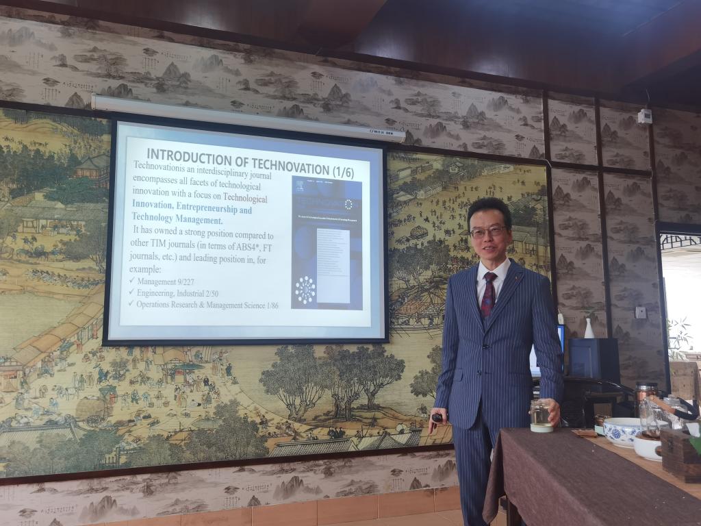 吴捷教授从国际权威期刊编辑的视角分享了国际期刊论文的撰写与投稿等内容,提供了宝贵的投稿建议和实用发表技巧,帮助在场的各位教师更好地理解国际学术出版的标准和流程。他的分享激发了在场听众的浓厚兴趣,现场提问环节气氛活跃,互动频繁。此外,吴捷教授还与部分教师就战略创新等议题进行座谈和深入交流。