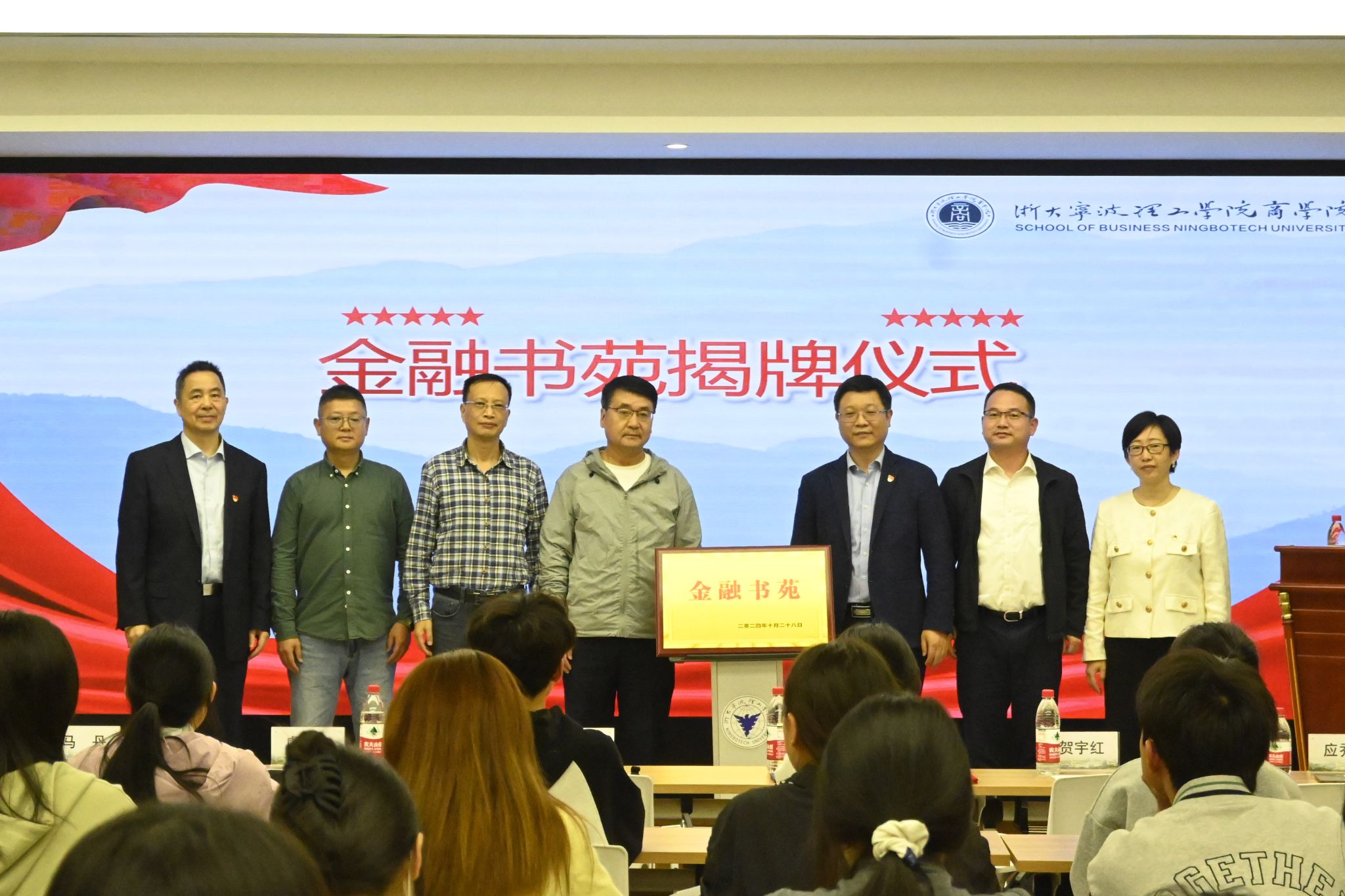 10月28日晚,金融书苑揭牌仪式在yl23411永利官网登录SC412举行,《宁波金融》主编肖成华、金融书苑捐赠人王珏麟、宁波市保险行业协会原副秘书长虞武定、原宁波市图书馆副馆长贺宇红、大童保险服务宁波分公司总经理马丹、中华联合财产保险股份有限公司宁波分公司副总经理应乔义等应邀出席,公司党委书记、副经理马翔、金融系主任朱兴婷、学工办主管潘剑邦、公司员工代表70余人参加仪式,公司党委副书记、纪委书记吴琼主持。